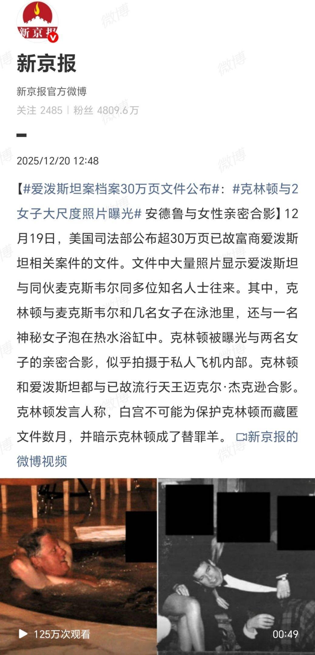 克林顿与2女子大尺度照片曝光当时我就震惊了!美权贵“桃色档案”尽显荒诞!克林顿玩的真花花。性丑闻是全球闻名,他与女子大尺度照片曝光,所谓“名人泳池派对年鉴”揭开美国权贵圈的荒诞一角。爱泼斯坦成权贵“首席摄影师”,白宫“替罪羊”辩解苍白无力,谁见过笑得灿烂、美女环绕泡澡的“替罪羊”?三十万页司法档案成《名利场》写真特辑,能拍十季“纸牌屋番外”。前总统在私人飞机和浴缸“外交洽谈”,杰克逊成清白背景板。白宫称不用藏文件,因其构图比政治宣言生动。这档丑闻凸显美国权贵虚伪,不禁让人追问:要多少“替罪羊”,才能掩盖他们的罪恶?
