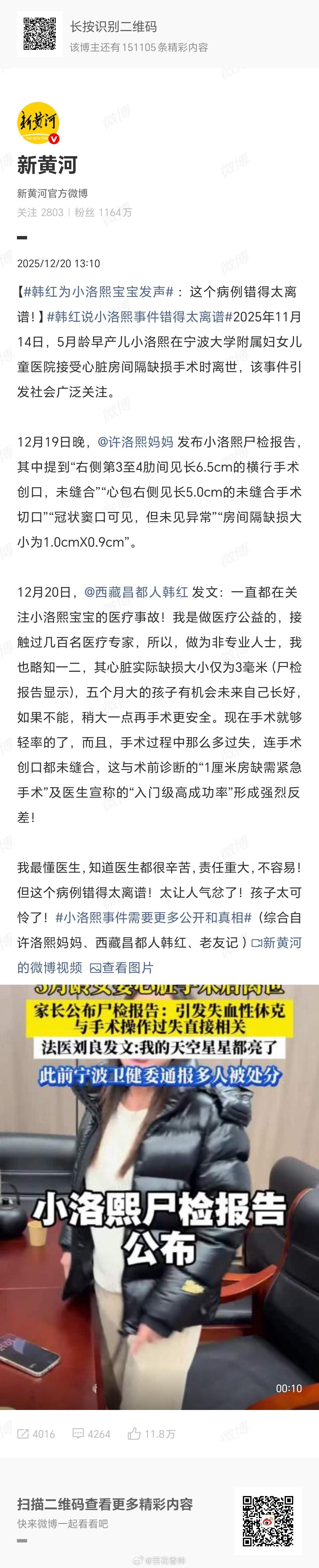 韩红为小洛熙宝宝发声宁波卫健委回应小洛熙事件最新进展“这不是医疗失误,这是庸医赤裸裸的谋杀!”韩红的愤怒疾呼,如重锤般敲打着每一个关注此事之人的心。一个仅仅5个月大、如春日嫩芽般娇嫩的小生命,就这样被一场本不该存在的手术无情夺走。3毫米的缺损竟被夸大成1厘米,术后创口甚至都不缝合,这哪里像是医者所为?医生的手,本应是挽救生命的妙手,此刻却成了悬在无辜生命之上的利刃。韩红说得掷地有声,这样的错误离谱到令人发指!别再用“辛苦”这块遮羞布来掩盖这令人痛心疾首的恶行,医生的天职是救死扶伤,而绝非草菅人命!必须彻查此事,给这个夭折的小生命一个公正的交代,给悲痛欲绝的家属一个心灵的慰藉!这让我想起了发生在我家的一件事。我的大姑十几年前做了心脏瓣膜置换手术,今年需要进行修复。起初去了北京最权威的医院检查,专家明确表示只需修复一个瓣膜即可。然而,考虑到北京医院家属探视时间每天仅两小时,多有不便,经亲戚推荐,表哥表妹便带大姑回到本地一线城市的某医院。谁能料到,这一决定竟让大姑遭受了更多的痛苦与经济负担。在这家医院,大姑不仅换了两个瓣膜、修复了一个,还做了心脏搭桥手术。报销完后,花费竟高达12万多。而在北京,按照最初的诊断,可能几万块就能解决问题。小地方的某些医院,为了一己之私,为了创收,全然不顾患者的身体与经济承受能力,不该做的手术硬做,没病也要调出毛病来。他们的眼里,只有金钱,却看不到患者的痛苦与绝望。医疗本应是充满人文关怀的净土,如今却被这些不良行径玷污。希望相关部门能够重视起来,严惩这些不良医院和医生,让医疗行业重新回归救死扶伤的初心。