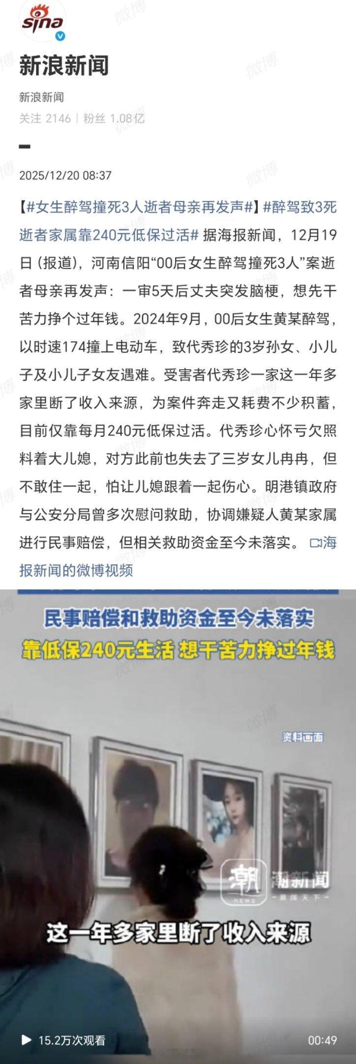 女生醉驾撞死3人逝者母亲再发声悲剧撕开醉驾之恶的狰狞獠牙。174公里的时速背后,是三个鲜活生命的瞬间陨落,更是数个家庭被碾碎的未来。每月240元的低保与“先干苦力挣个过年钱”的苦涩,映照出受害者在失去至亲后,更坠入生存与尊严的双重深渊。民事赔偿至今未落实,暴露了善后机制的空转与冷漠。对醉驾者的严惩,是对逝者的告慰,更是对生者的交代。此案当成为一记惊雷,唤醒对醉驾零容忍的社会共识,并拷问承诺之后的执行力——对受害者的切实救济,比任何慰问都更关乎正义。