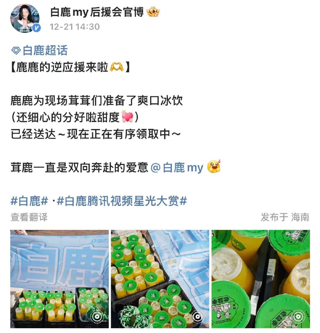 白鹿准备了星光大赏逆应援白鹿给粉丝准备逆应援 12月21日,发文给粉丝准备了星光大赏逆应援,“鹿鹿为现场茸茸们准备了爽口冰饮(还细心的分好啦甜度)已经送达~现在正在有序领取中~茸鹿一直是双向奔赴的爱意”白鹿 星光大赏红毯