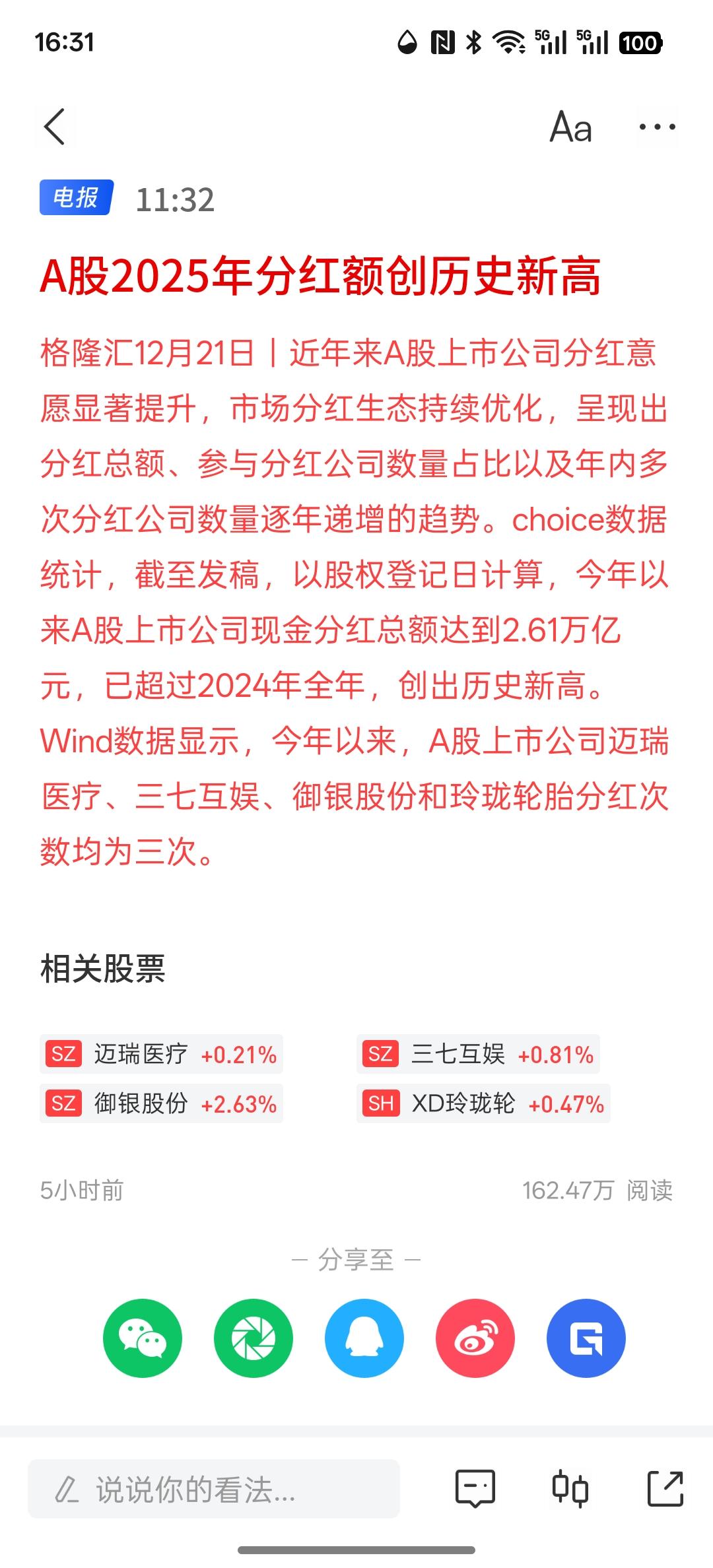 A股2025年分红额创历史新高,今年以来,很多上市公司大力分红,未来企业分红是大概率的事情,因为要提倡上市公司给二级市场的投资者们实现分红,不再像之前那样,铁公鸡一毛不拔!有释放更多的红利,让投资者有利益可赚,可以带动消费