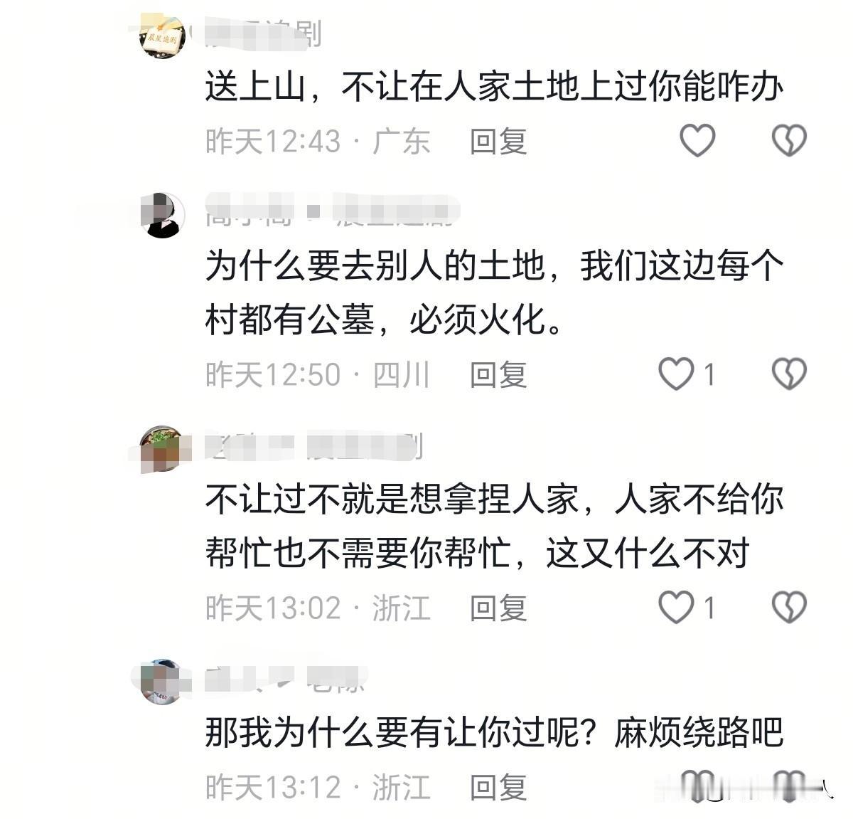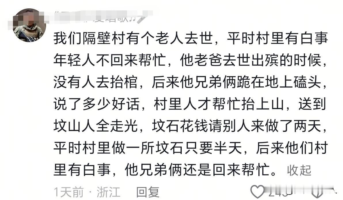 靠红白喜事,想拿捏那些农村外出打工平时不回去帮忙的时代,已经过去了 都快2026年了还有网友说这样的话:“村有个老人去世,平时村里有白事年轻人不回来帮忙,他老爸去世出殡的时候,没有人去抬棺,后来他兄弟俩跪在地上磕头,说了多少好话,村里人才帮忙抬上山,后来他们村里有白事,他兄弟俩还是回来帮忙”。 这样的事情,要是在20多年前,我相信,但现在的农村,只要能通车的地方,都有专门的红白喜事一条龙服务,完全不需要办白事的家人操心,白事需要的抬棺、守夜等程序他们都会帮你做好,事主只需要做好付钱就行。 图3那两个想用红白喜事拿捏他人的嘴脸,真的是够了!就因为白事有一条龙了,拿捏不了别人,竟然说不让别人抬棺从他家地里路过! 个人觉得:农村在外打工的人也不容易,村里老人那么多,不是堂亲也要让年轻人回家帮忙是很不合理的。 要知道来回至少要三四天,请假的工资,来回路费,加起来需要大几千块钱。 以前是没办法,不回家帮忙真的会被拿捏,但现在有专门的红白喜事团队,就没有必要担心自己不回去,将来轮到自己家,被村里的其他人故意拿捏。