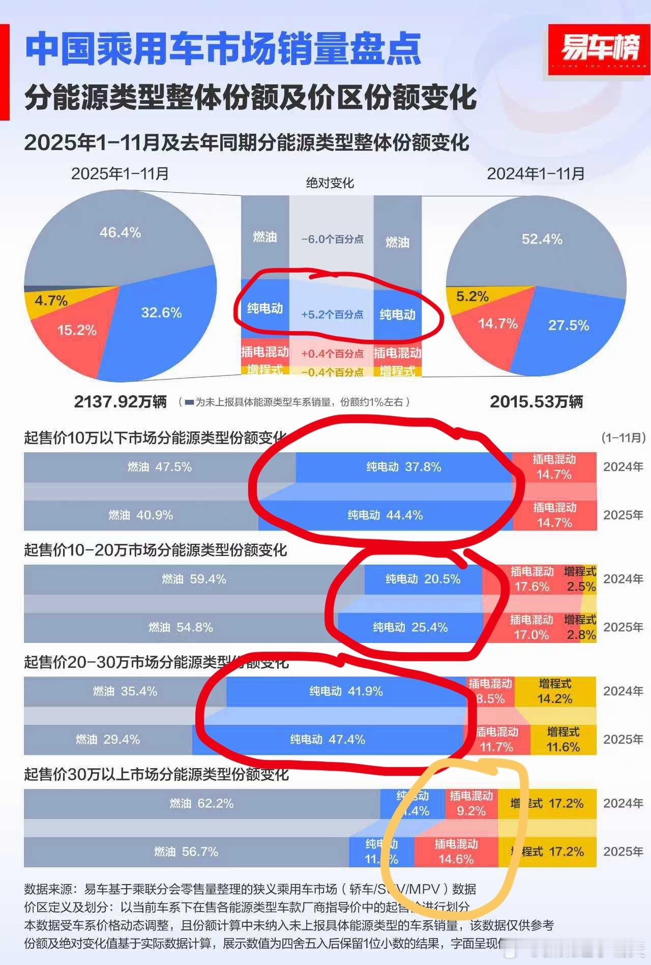 今年纯电份额大涨5.2个百分点,主要驱动还是来自于30万以下,尤其是20万以下的市场~30万以上的高端市场,今年是“新插混”的份额在增长,这可能很多人都没想到。过去的插混是“小电池混动”打主流市场,而“新插混”是以“可直驱的大电池增程”的形态,进攻高端市场。这也说明,传统厂商在高端市场正发力。(国内的插混只有几个传统厂商在玩,新势力都是增程)增程和插混之争,好像还没结束大v聊车新能源汽车