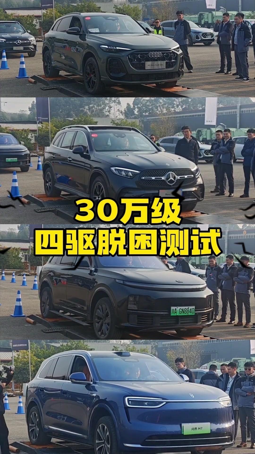 30万级四驱车谁更强?🐎30万级四驱脱困测试,奥迪Q5L单轮牵引力超足,轻松通过各种路况,对比宝马X3直接被“劝退”,奔驰GLC单轮动力也不错顺利上来,但到了问界,工作人员直接让推下去。看来30万级四驱车,奥迪才是真靠谱。