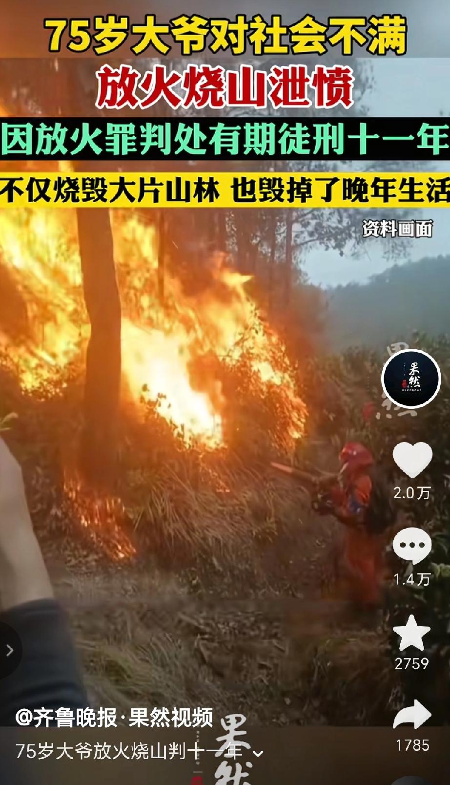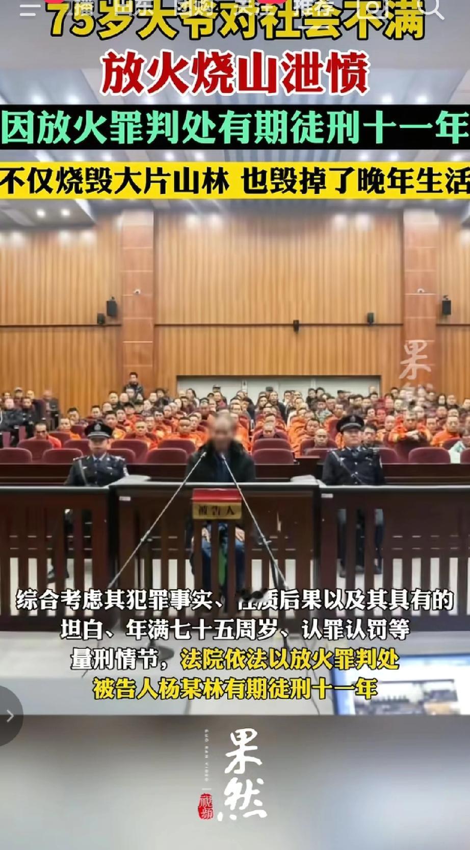7 2025年12月19日,贵州省黔南州惠水县人民法院依法公开审理了, 75岁的杨某某因对社会心生不满,选择放火烧山泄愤,综合考虑其犯罪事实、性质后果以及坦白、年满七十五周岁、认罪认罚等量刑情节,以放火罪判处杨某某有期徒刑十一年,他的冲动之举也让本该安享晚年的生活毁掉。(来源于@齐鲁晚报·果然视频)