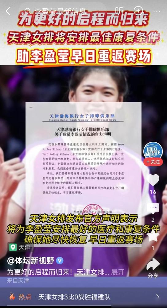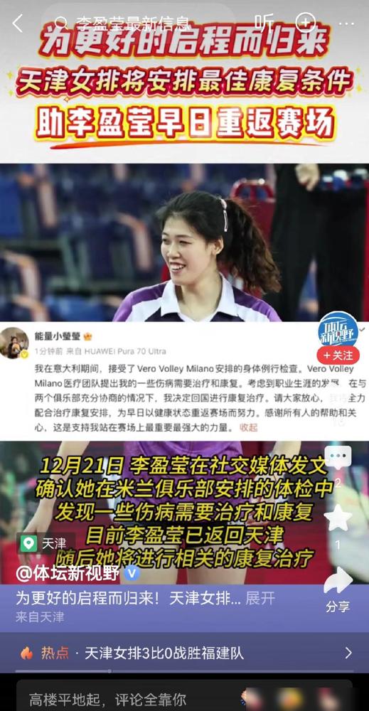遗憾!李盈莹与天津女排官方同时公布,回国接受康复治疗。 本来大家都盼着她能在米兰开启留洋新征程,结果在意大利那边做完例行体检发现,身体状况还是没达到比赛要求,现在人已经确定要回天津队继续养了。 说实话,我感觉这次的操作确实让人有点摸不着头脑。 既然人都已经飞过去准备入职了,前期经纪公司和俱乐部之间的沟通和预检是不是做得不够细? 这种“折返跑”对球员的消耗其实挺大的,不仅是体力,还有心气儿。 但我更在意的是,既然米兰那边的体检确定了还需要康复,这种严谨态度虽然显得有点“冷酷”,但对职业生涯长远来看,大概率不是坏事。 天津女排这次的反应非常迅速,直接承诺会提供最好的康复条件助她回归。 毕竟回到了熟悉的大本营,医疗团队和生活环境都更利于恢复,也算是在遗憾中给球迷吃了一颗定心丸。 李盈莹自己在社媒上也确认了这件事,感觉她心态还算稳,这真的很难得。 以前总觉得留洋只要实力够就行,现在看这些场外的专业对接和身体冗余度,可能才是最大的考验。 最戳我的是那种落差感,本以为是去征服意甲,结果变成了跨国体检。 现在只能希望她别有心理包袱,既然回国了就踏实配合治疗,健康的“妹妹”才是最无敌的,赛场不差这几天。