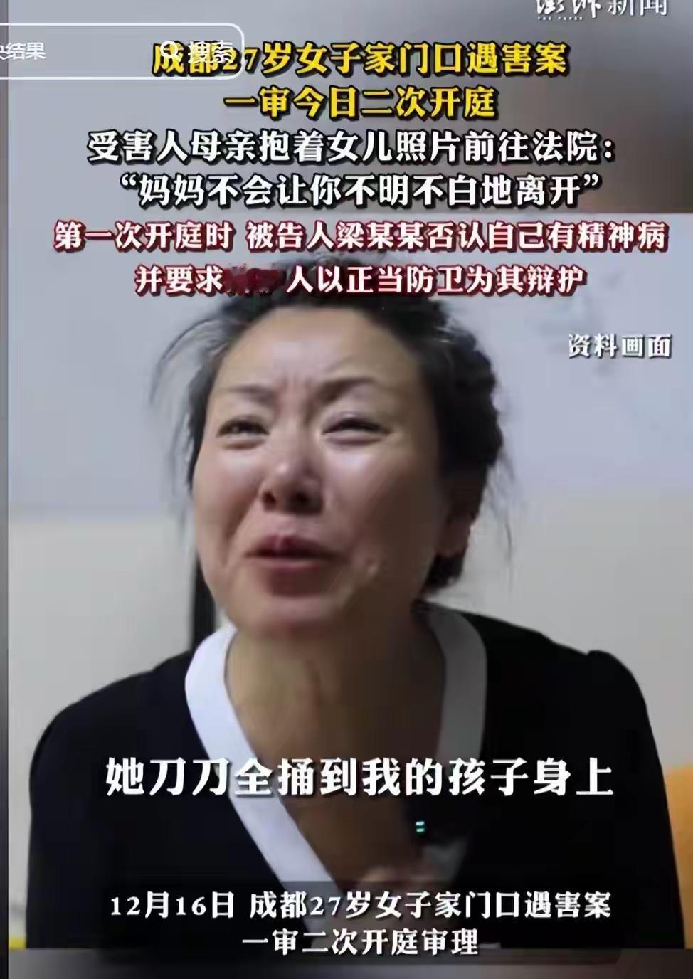 梁某滢背后肯定有高人指点,她本来是有精神病鉴定证书的,但对方律师质疑报告的真实性那在情理之中,她自己却坚称自己没病,这就是一种手段了! “成都女子家门口遇害案”一审判处被告人死刑, 缓期二年执行,紫雅妈妈不能接受这个结果,哭的死去活来,明确表示自己要上诉! 梁某莹越说自己没病,越能让人觉得她是真有病,因为精神病身份是她的救命稻草,她肯放弃这个身份,就能反向思维,证明她真有病,不得不说,她真是得到了高人指点了! 人家姑娘在自家门口,好好的生命就没了,她作为害人者,付出什么代价也是应该的!