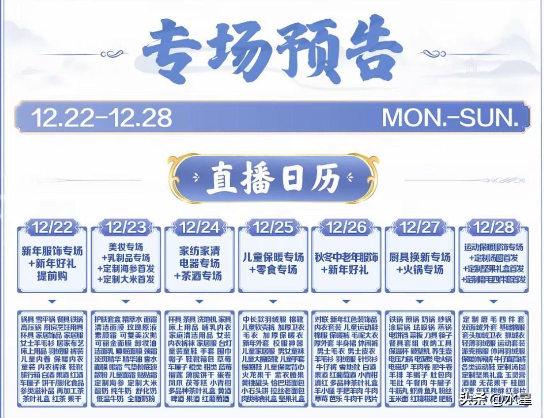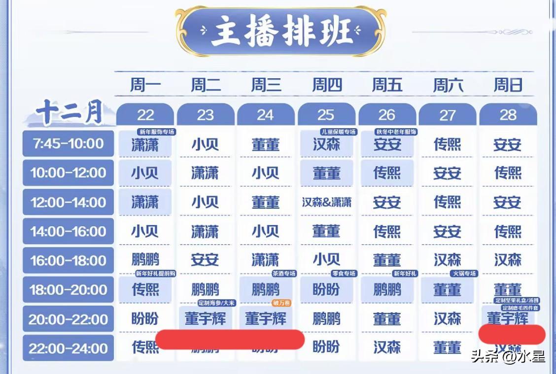 与辉同行发布了最新排班表 这含辉量也太高了[耶] 一周有3天上播 4款新的定制品上线 周二是大米和海参 周日是坚果礼盒跟汤圆 还有定制款磨毛四件套返场 大家对定制品的热情很高 就是产量跟不上 虽然也希望随时想买随时有 不过也不会去催促宇辉 俗话说慢工出细活儿 品质保证还是第一位的 等合作的厂家生产流程捋顺了 产能跟上了 产量自然就上来了 咱们不着急 宇辉出品,不是精品[耶]