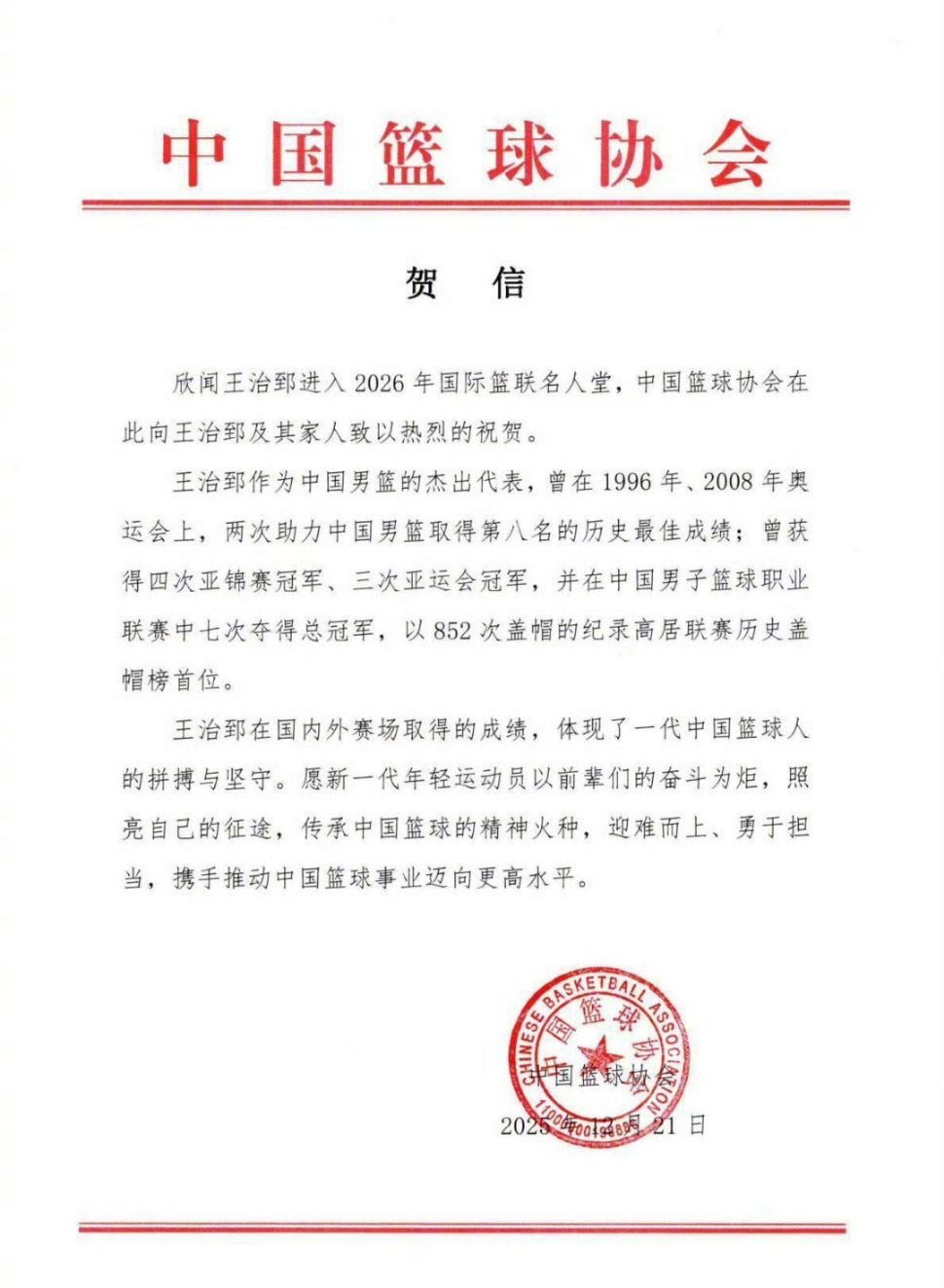 2026国际篮联名人堂名单公布,王治郅入选!中国篮协发布贺信:欣闻王治郅进入2026年国际篮联名人堂,中国篮球协会在此向王治郅及其家人致以热烈的祝贺。王治郅入选国际篮联篮球名人堂篮协祝贺王治郅