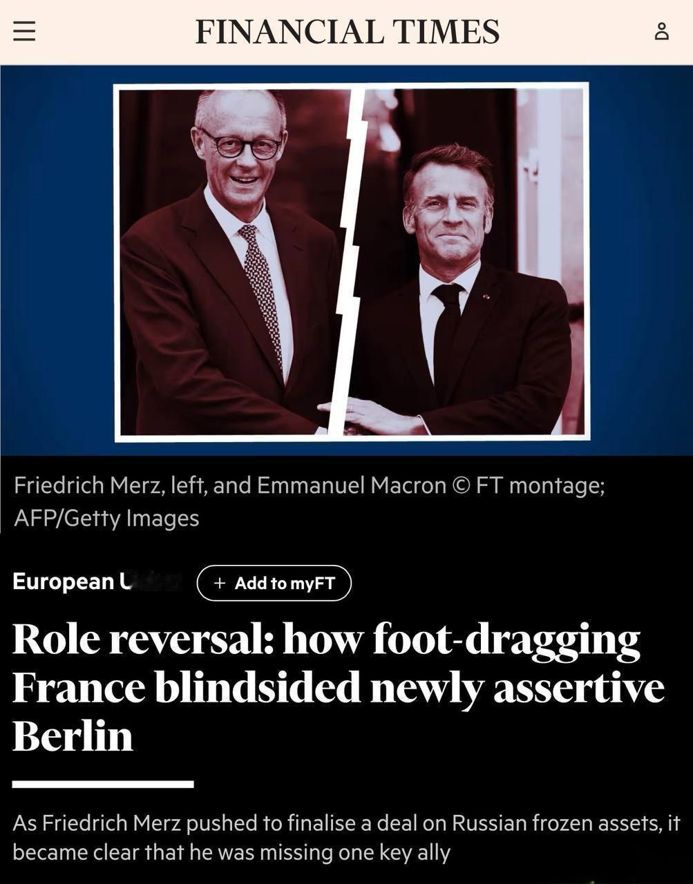 马克龙背叛了默尔茨,法国最后一刻加入了欧盟反对冻结俄罗斯资产的阵营。这位男人如此软弱,只能向梅洛尼屈服。 来源:Financial Times