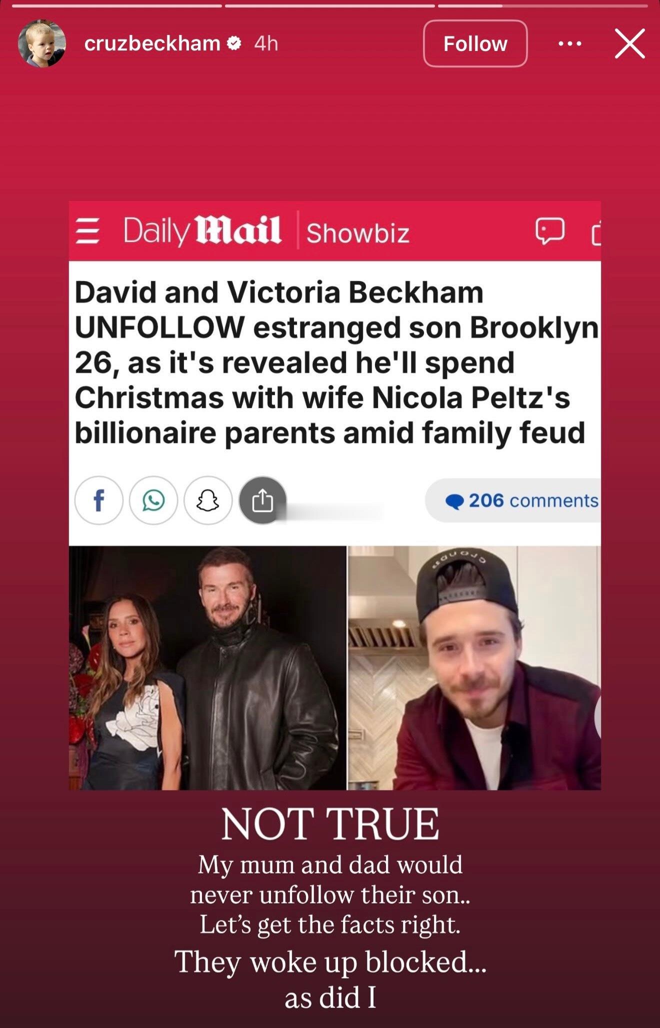 贝克汉姆夫妇与大儿子互相取关 外媒曝贝克汉姆夫妇和长子的关系再恶化,双方相互取消ins关注,贝克汉姆家老三克鲁兹转发媒体报导强调非事实,并透露老大布鲁克林在ins上拉黑了全家,“我父母绝不会主动取关亲生儿子...先说清事实。他们是醒来发现被拉黑的...我也是。”