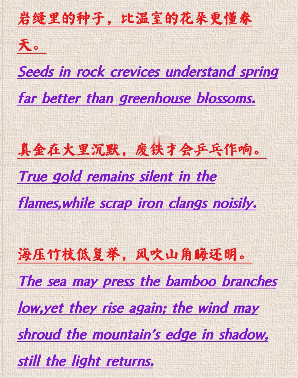 岩缝里的种子,比温室的花朵更懂春天。 Seeds in rock crevices understand spring far better than greenhouse blossoms. 真金在火里沉默,废铁才会乒乓作响。 True gold remains silent in the flames,while scrap iron clangs noisily. 海压竹枝低复举,风吹山角晦还明。 The sea may press the bamboo branches low,yet they rise again; the wind may shroud the mountain's edge in shadow, still the light returns.