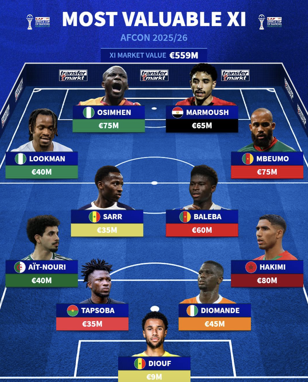 摩洛哥的阿什拉夫以8000万欧的身价领衔5.59亿欧阵容,其中尼日利亚、塞内加尔和喀麦隆分别有两人入选。
