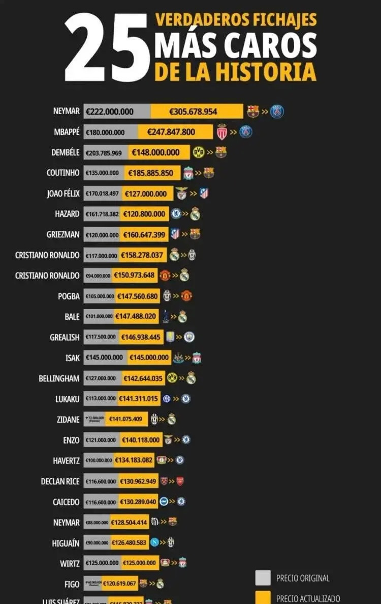 欧冠 马卡报罗列了通货膨胀后的足坛历史25大最贵转会榜,他们是由皇马、巴萨、利物浦、切尔西、曼联、阿森纳、国米、马竞、多特、尤文、巴黎、热刺、布莱顿等球队的转会,具体如下:1.内马尔(巴萨→巴黎),原2.22亿,现3.057亿2.姆巴佩(摩纳哥→巴黎),原1.80亿, 现2.478亿3.登贝莱(多特→巴萨),原1.48亿, 现2.038亿4.库蒂尼奥(利物浦→巴萨),原1.35亿, 现1.859亿5.菲利克斯(本菲卡→>马竞),原1.27亿,现1.700亿6.阿扎尔(切尔西→皇马),原1.208亿, 现1.617亿7.格列兹曼(马竞→巴萨),原1.20亿, 现1.606亿8.克里斯蒂亚诺·罗纳尔多(皇马→尤文),原1.17亿,现1.583亿9.C罗(曼联→皇马),原0.94亿,现1.510亿10.博格巴(尤文→曼联),原1.05亿,现1.476亿11.贝尔(热刺→皇马),原1.01亿,现1.474亿12.格拉利什(阿斯顿维拉→曼城),原1.175亿,现1.469亿13.伊萨克(纽卡斯尔→利物浦),原1.45 亿,现1.45亿14.贝林厄姆(多特→皇马),原1.27亿, 现1.426亿15.卢卡库(国米→切尔西),原1.13亿, 现1.413亿16.齐达内(尤文→皇马),原0.72亿,现1.411亿17.恩佐(本菲卡→切尔西),原1.21亿, 现1.401亿18.哈弗茨(勒沃库森→切尔西),原1.00 亿,现1.342亿19.赖斯(西汉姆→阿森纳),原1.166亿, 现1.310亿20.凯塞多(布莱顿→切尔西),原1.166 亿,现1.303亿21.内马尔(桑托斯→巴萨),原0.88亿, 现1.285亿22.伊瓜因(那不勒斯→尤文),原0.90亿, 现1.265亿23.维尔茨(勒沃库森→利物浦),原1.25 亿,现1.25亿24.菲戈(巴萨→皇马),原0.60亿,现1.269亿25.路易斯·苏亚雷斯(利物浦→巴萨), 原0.817亿,现1.168亿欧冠联赛