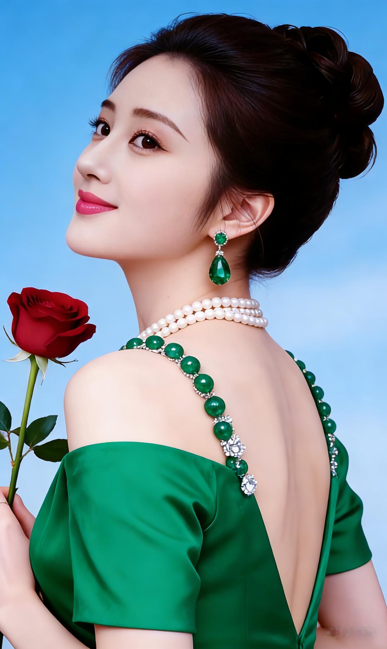 今天,我穿着优雅的长裙,手持玫瑰,心情如这花般娇艳。