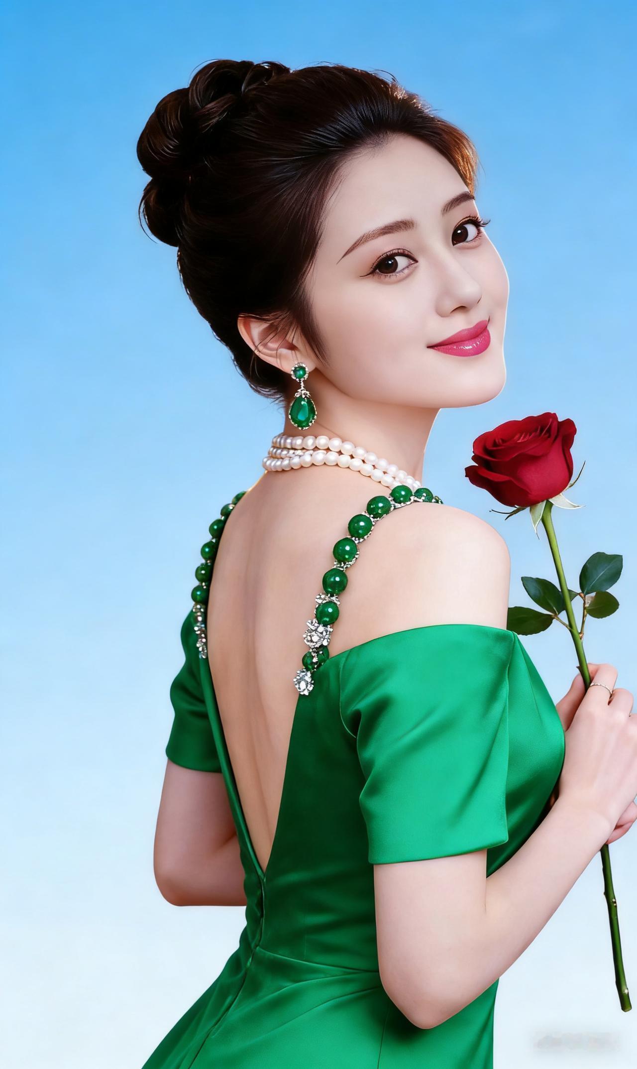 美女身着红色中式旗装,绣花精美,翡翠耳坠点缀,古建门窗背景朦胧,光影柔和,古典宁