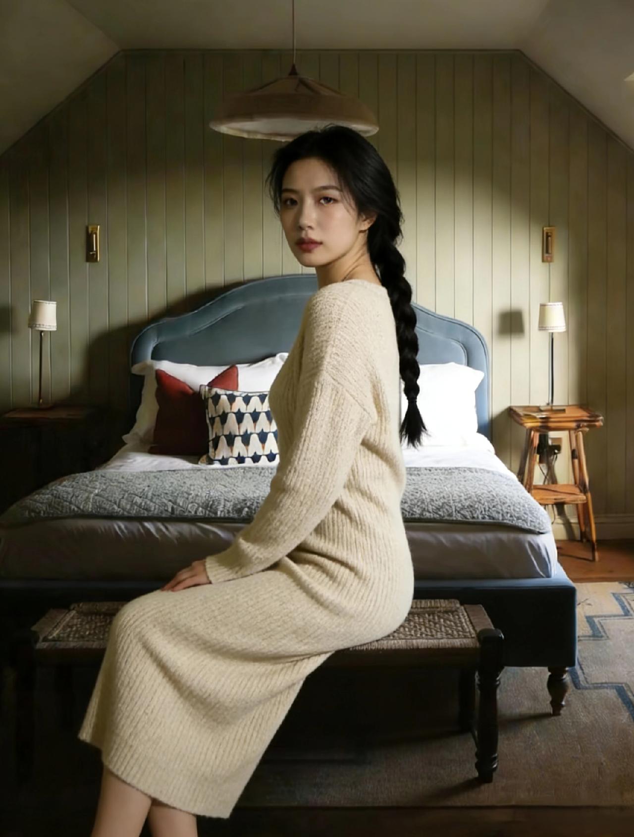 她坐着,是阁楼里的一件静物 米白针织裙是肌理,黑辫是线条 床的蓝,墙的绿,是铺陈的底色 吊灯垂着,像一枚暂停的钟摆 ~ 不必说话,姿态就是语言 侧身的弧度,藏着未展开的情节 抱枕的花纹,是偶然闯入的几何 木凳的纹理,刻着岁月的掌纹 ~ 光从斜处来,分割了空间 一半明亮,一半沉在阴影里 她的目光,是穿过画面的箭 钉住看客,也钉住自己的存在 ~ 静物不会老去,如同此刻 她被定格在,温柔与疏离的交界 阁楼是玻璃罩,罩住这瞬的永恒 风过,只掀动一缕发梢的波澜