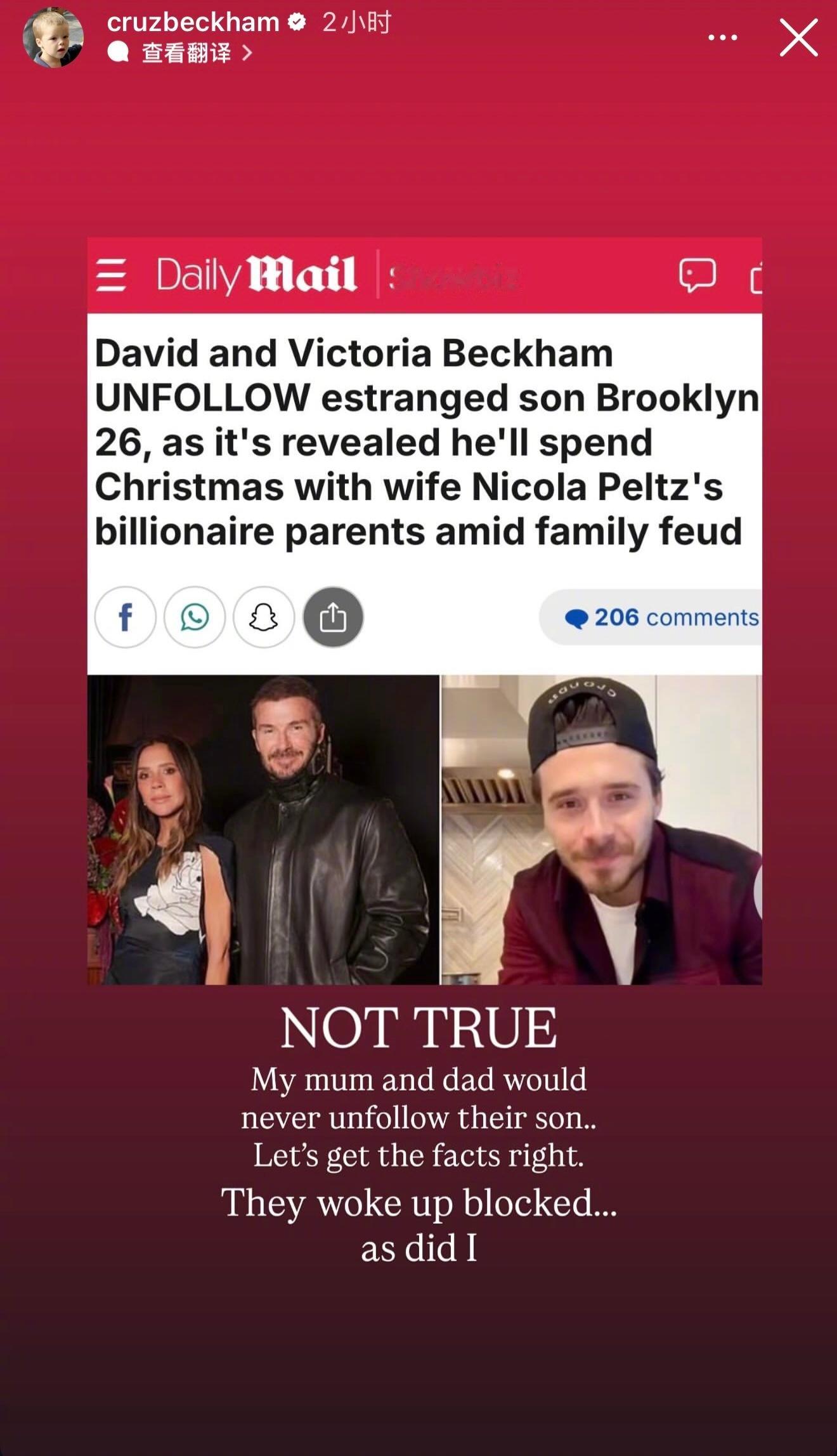 欧美八卦新闻,今日的欧美娱乐八卦头条!一开始,英国《每日邮报》报道了一条八卦新闻,说贝克汉姆夫妇在圣诞前夕取关了大儿子。结果,老三克鲁兹第一时间再次站了出来为父母澄清,他在Instagram Story上转发了《每日邮报》的这条标题报道页面,并说:“这不是真的。我爸妈绝不会取消关注他们的儿子……让我们把事实弄清楚。他们醒来发现自己被大儿子拉黑了……我也一样,”(哎!维多利亚之前好给大少爷做饭的视频点赞,即便这儿子已经不理父母了)。老二罗密欧之前因为布鲁克林夫妇拿他的女友搞事,早已取关了这对夫妇,而布鲁克林当时也取关了老二!自2025年初以来,贝克汉姆一家就因为大儿子饱受不和传闻的困扰。今年5月,布鲁克林和妻子妮可拉·佩尔茨没有出席贝克汉姆的50岁生日派对,6月又缺席了维多利亚在巴黎时装周的发布秀。8月,布鲁克林和妮可拉再次举行结婚誓言重温仪式,没有邀请贝克汉姆夫妇及兄弟妹妹。而,妮可拉通过八卦媒体放出风说,之所以重新举办结婚誓言仪式,是因为婆婆维多利亚在婚礼上抢了她的风头,毁了她的婚礼。而事实上搞砸她婚礼的是她和她父母自己请的婚庆公司,婚礼一结束,她和父母就起诉这家婚庆公司,官司是否打赢不详(婚庆公司当时也向媒体控诉了这家人)。但妮可拉却将她婚礼的各种不顺心最终归咎到了婆婆身上。今年10月,布鲁克林夫妇继续缺席了维多利亚纪录片的首映礼。 ps:儿子养大成人,终究是别人家的人;真正孝顺的,寥寥可数! 据说,妮可拉的新片要上映了!