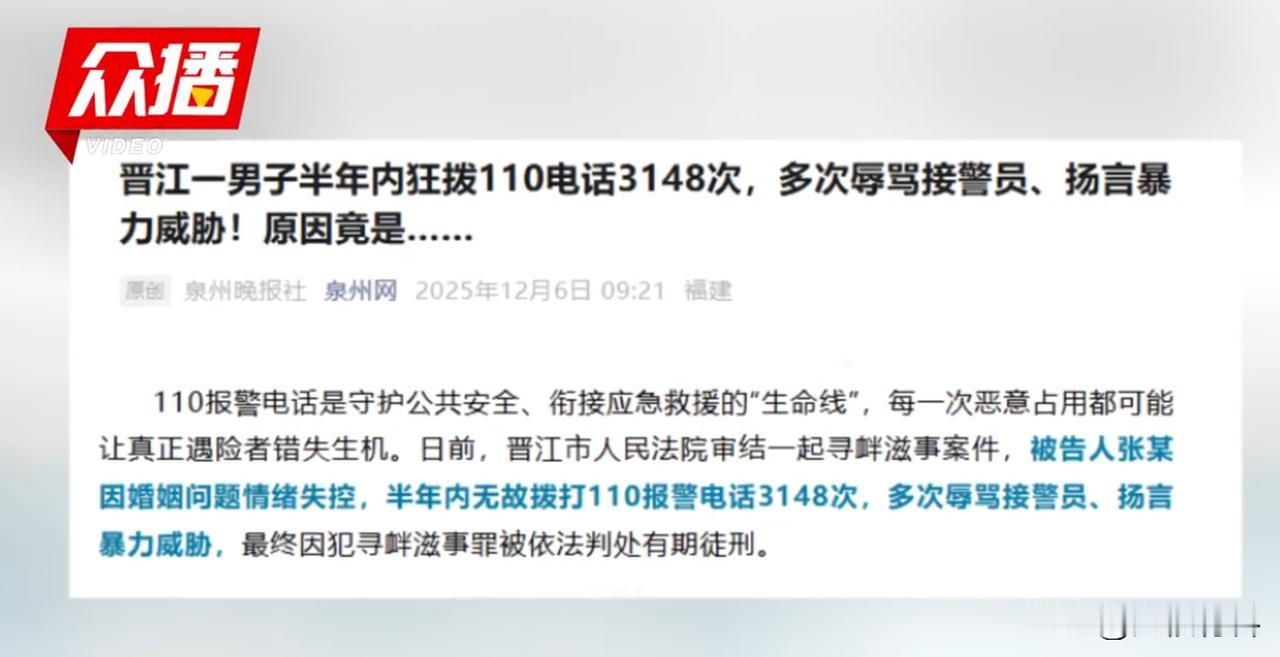 “必须严惩!”2022年1月,福建泉州,一男子因为和妻子吵架,心里窝火没处撒,竟然拨通了110报警电话,在电话中,他多次对着接警员破口大骂,甚至放狠话威胁人。更令人感到气愤的是,短短半年时间里,他竟然狂打110足足有3000多次。法院:构成寻衅滋事,判了! 咱们都知道,110报警电话可不是随便拨着玩的,它是守护公共安全、衔接应急救援的“生命线”,但凡有人没正事乱打占用,很可能就让那些真遇到危险、等着救命的人,彻底错过活下去的机会。 家住晋江市的张某,由于婚姻上的问题,情绪非常糟糕,没处发火的他竟然拨通了110报警电话。张某感觉自己可算找到了发泄情绪的渠道,短短半年内竟然打了3148次报警电话。 在通话中,他多次对着接警员破口大骂,出口成“脏”,一会说要杀人,一会又说要自杀,严重扰乱警方正常工作,浪费警务资源。 经过法院审判,认定他的行为构成寻衅滋事,并且情节恶劣,对他判处了有期徒刑,网友们对此直呼:大快人心! 说起来,这事干的是真缺德,一来,无效报警占线又占人,真碰到盗窃、暴力伤害、紧急求助的人,没法及时等警察来,可能出严重后果;二来,辱骂恐吓接警员,也是对执法人员权益的侵害,还会让公安机关的执法权威打折扣。 大伙儿平时可得自觉守规矩,别乱占用公共资源,别把报警电话当成个人情绪的宣泄工具,齐心协力把110这条“救命线”护好。 信息来源:《晋江一男子狂拨110电话3148次,多次辱骂接警员、扬言暴力威胁》北方法制报