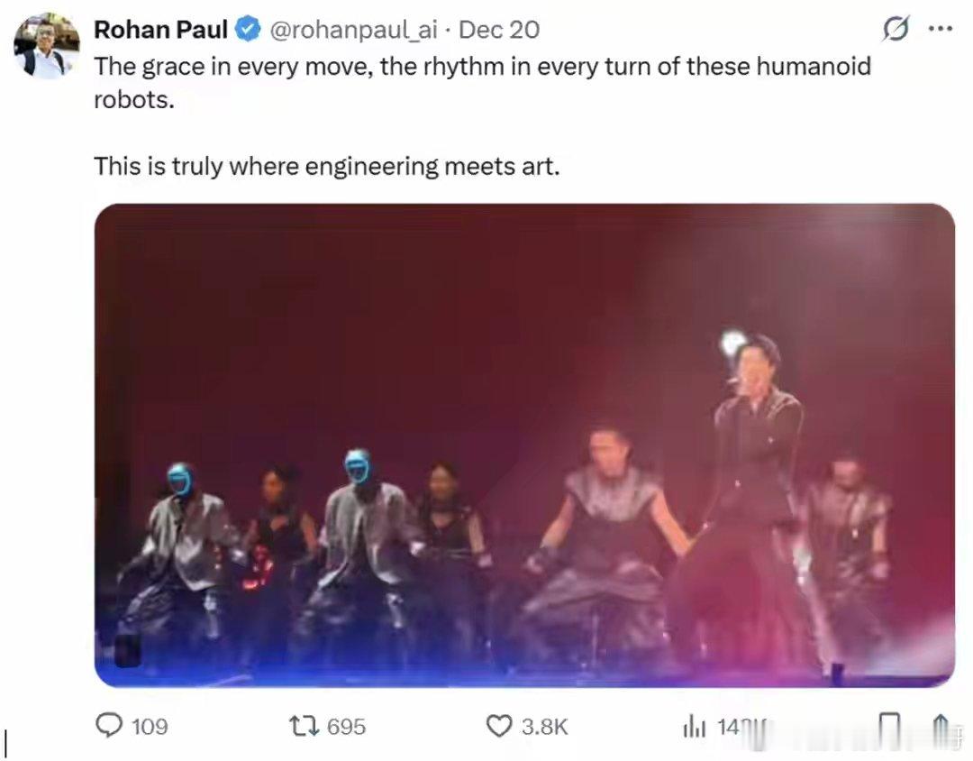 星光大赏内场“王力宏演唱会伴舞机器人”视频火了,俄媒感叹:这是中国!转发“王力宏演唱会伴舞机器人”视频,俄媒感叹:这不是科幻,这是中国!近日,“王力宏演唱会伴舞机器人”火了。北京时间21日,“今日俄罗斯”(RT)也在社交平台X上转发相关视频,并发出感叹。“这不是科幻,这是中国。”RT在配文中写道,“人形机器人在演唱会现场与人类完美同步跳舞。”RT帖文截图12月20日,话题马斯克点赞王力宏伴舞机器人就曾登上微博热搜。据媒体报道,12月18日,王力宏成都演唱会首次引入人形机器人伴舞,共同演绎《火力全开》。6名宇树科技G1机器人身着银色亮片服装,精准卡点音乐节奏,动作与王力宏及其伴舞高度同步。最后表演以机器人一起完成高难度“韦伯斯特”空翻结尾。随后,王力宏工作室发文认证“全球首个演唱会机器人舞台来袭”。值得注意的是,特斯拉CEO马斯克当地时间19日在社交平台X也转发了相关视频,并评价“令人印象深刻”。↓除RT和马斯克外,不少外国网友也在X上对相关视频发表评论,谈论视频中酷炫的机器人。有网友表示,“相当酷。”“难以置信。”↓有网友赞叹,“这些人形机器人的每一个动作的优雅,每一个转身的节奏。这才是真正的工程与艺术的融合。”↓还有网友感叹,“真是太疯狂了。科技发展如此之快——想象一下几年后现场表演将会有多么不同。”↓