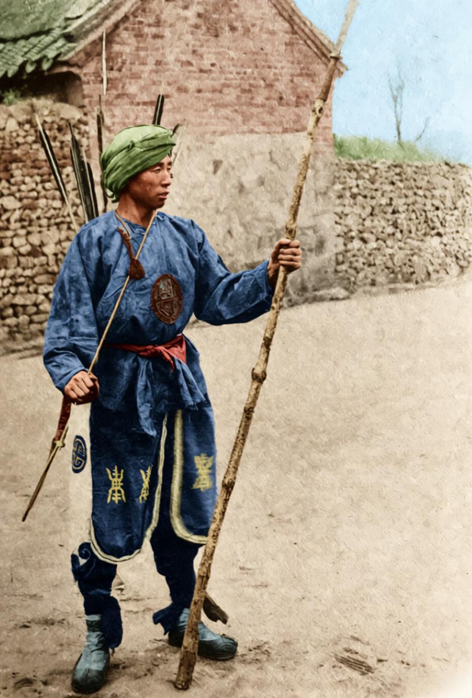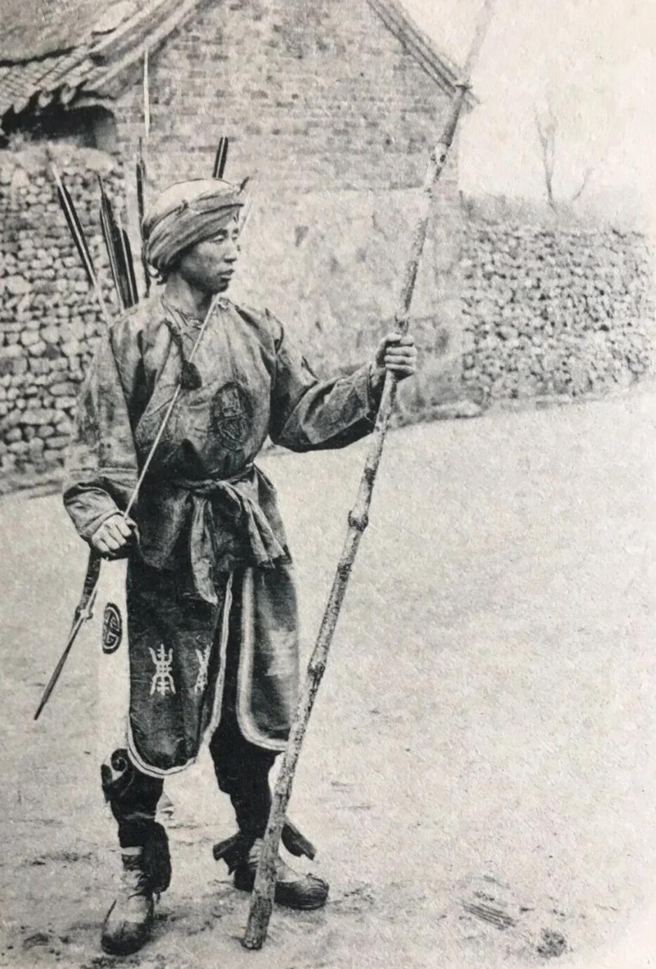 这张照片定格的是晚清义和团拳民,拳民裹着旧布头巾,身上的粗布短褂满是褶皱,背后箭囊插满箭矢,左手攥着弓箭、右手拄着长杆兵器(长矛类) 身后是乡村石墙与土坯民居,泥泞地面裹着尘土,义和团成员多是华北乡村的农民、手工业者,在列强侵略加剧的晚清,他们以简陋的传统器械,凝聚成民间反帝的基层力量。