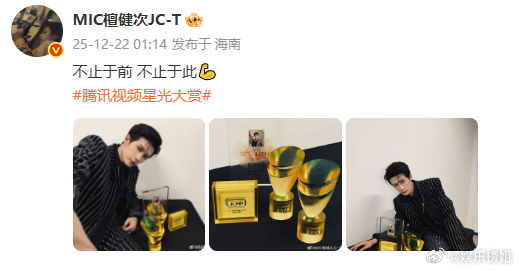 檀健次晒三个奖杯檀健次晒出在2025腾讯视频星光大赏上横扫年度星光演员、年度JUMP勋章荣誉和腾讯视频VIP之星三项大奖杯,你说要“不止于前 不止于此”真的是实至名归,好好加油!不负每一份期待!檀健次你最棒的2025娱乐年终盘点非正式跨年派对