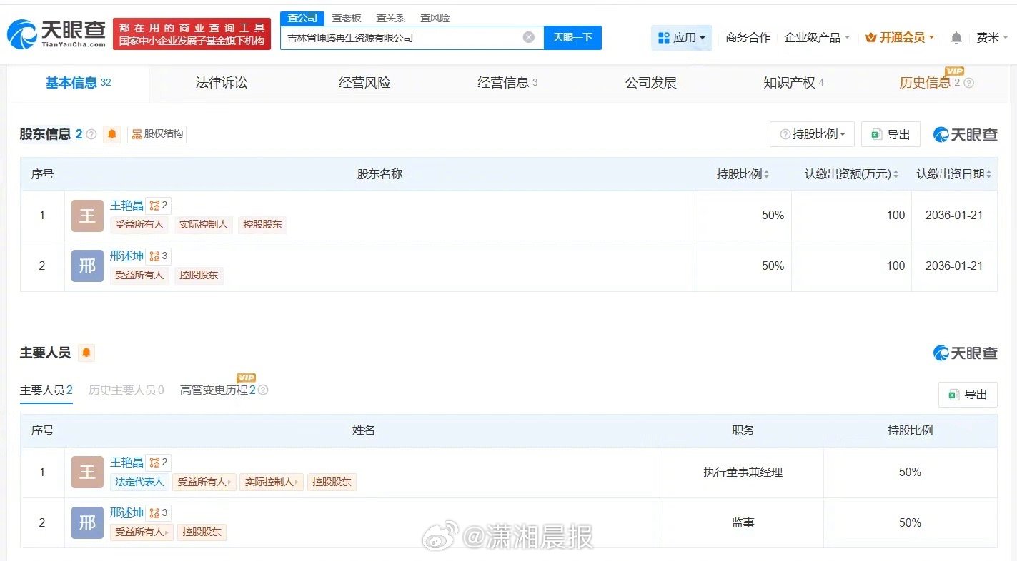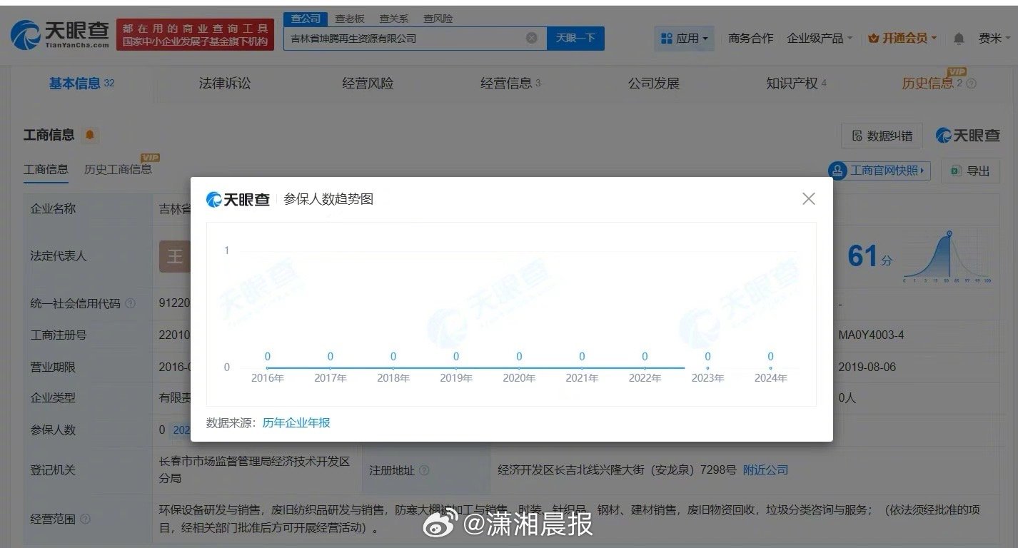 【#揭秘旧衣回收乱象涉事公司#,#旧衣回收乱象公司多年参保人数为0#】#央视曝光旧衣回收产业#近日,央视曝光旧衣回收产业链内幕、直播间售卖乱象频出的问题,坤腾再生资源有限公司被点名。潇湘晨报记者查询天眼查发现,涉事企业吉林省坤腾再生资源有限公司成立于2016年1月,法定代表人为王艳晶,注册资本200万人民币,经营范围包括环保设备研发与销售、废旧纺织品研发与销售、防寒大棚被加工与销售等,由王艳晶、邢述坤共同持股。年报信息显示,该公司连续多年参保人数为0。 吉林
