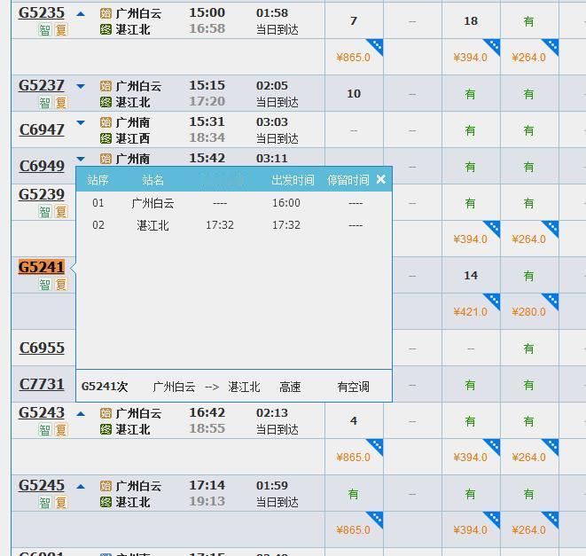 【广湛高铁今天正式通车】广湛高铁将于12月22日正式通车!标杆车G5241次,下午4点从广州白云站出发,中途不停,17:32就到湛江北,全程只要92分钟!其他车次主要有停靠湛江北、茂名南、阳江北、新兴南。 虽然用时是快了不少了,但是价格也是贵了不少!以G5241为例,一等座票价为421元,二等座单程需要280元。其他车次有停靠沿途站点的,二等座票价也需要264元。 大家觉得广湛高铁算是水鱼线不?