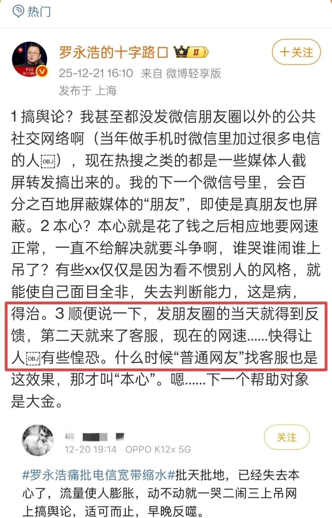 罗永浩吐槽上海电信网速太慢后续:现在网速快的让人惶恐。 从这件事,我想到两点: 1、如罗永浩所说,如果普通网友反应这些问题,是不是也会有效果?如果没有,算不算给罗永浩单独开后门? 2、如果罗永浩说的是真的,那证明电信完全有能力将网速提高,那是什么原因导致他们没去做?