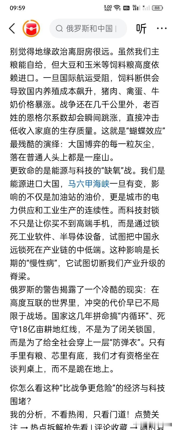 既然如此,何必当初? 现代战争已经不仅仅是限于战争本身,而是一场全世界的原材料和科技大战,好像是这么回事。“因为普京的警告让人后背发凉?因为中囯和世界贴的太紧了。” 但是实际上,又似乎是俄罗斯方面摔先发动的战争。难道是乌克兰欺负俄罗斯,军队冲进俄罗斯的囯土和境内了吗?好像又不是这种情况。“俄罗斯的警告揭露了一个冷酷的现实:在高度互联的世界里,冲突的代价早已经不限于战场。”实际上这不是普京的或俄罗斯的警告,而更应该是俄罗斯现实的教训。俄罗斯好像自恃力大无穷,世界上没有很多国家敢对他怎么样,结果似乎恰恰相反,不仅仅是拒绝他的石油、煤炭、天然气,就是存放在别的国家的钱和财产,也敢冻结、扣押,甚至是还有可能被没收。 如果有人敢一意孤行,不顾人类社会发展的文明趋势,估计俄罗斯就可能是一个活生生的现实例子。特别是有些人动辄喊打喊杀,以为打了人杀了人,就一了百了了,估计还是太幼稚可笑了。
