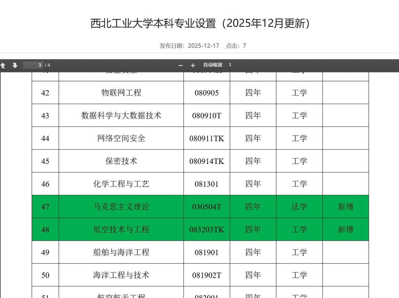 推陈出新,2025年西北工业大学新增4个招生专业、暂停9个专业招生 2025年西北工业大学暂停招生的9个本科专业中,不仅有新入“天坑”的土木工程专业,也有一些陈旧的电子商务、市场营销等专业,更有学习难度较大的电磁场与无线技术、测控技术与仪器等专业,这些专业在招生、就业等方面已存在一定困难,减少或暂停招生也是对学生负责。 同年,西北工业大学也新增了4个招生专业,其中2个是中外合作专业,分别是人工智能、智能交互设计,归西北工业大学伦敦玛丽女王大学工程学院招生;这两个专业,都采用4+0的培养模式,毕业时可获得”双学位“,预计2026年开始招生。另2个专业分别是马克思主义理论、低空技术与工程,低空技术与工程是为低空经济服务,人才缺口大。 关注招生专业的变化,紧跟时代步伐,避免入校即入坑。