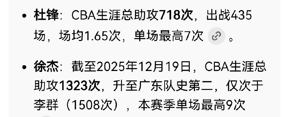 杜锋对助攻次数真的不在乎,他说自己助攻也多,其实不到徐杰的一半 记者很喜欢无聊的数据,事实上这在CBA官网都可以查到,徐杰现在助攻1508次,距离宏远最高的李群少160多次,本赛季超越很正常,李群还是因为打CBA没有几个赛季,主要是之前不在CBA,当时叫全国篮球联赛。 杜锋说根本不在乎这样的数据,球员认认真真打球就行,昨晚的9次助攻,当然也包括奎因同样的数据都是个人赛季助攻最高,杜锋说自己助攻也不少,其实他718次,在大前锋里3不少,肯定没法和控卫比。 萨姆那对徐杰评价很高,他现在突破好外,最突出的 还是三分球投机很准,传球外多倒球就行,广东队传球好手不少,两个小外援和萨林杰都不错。