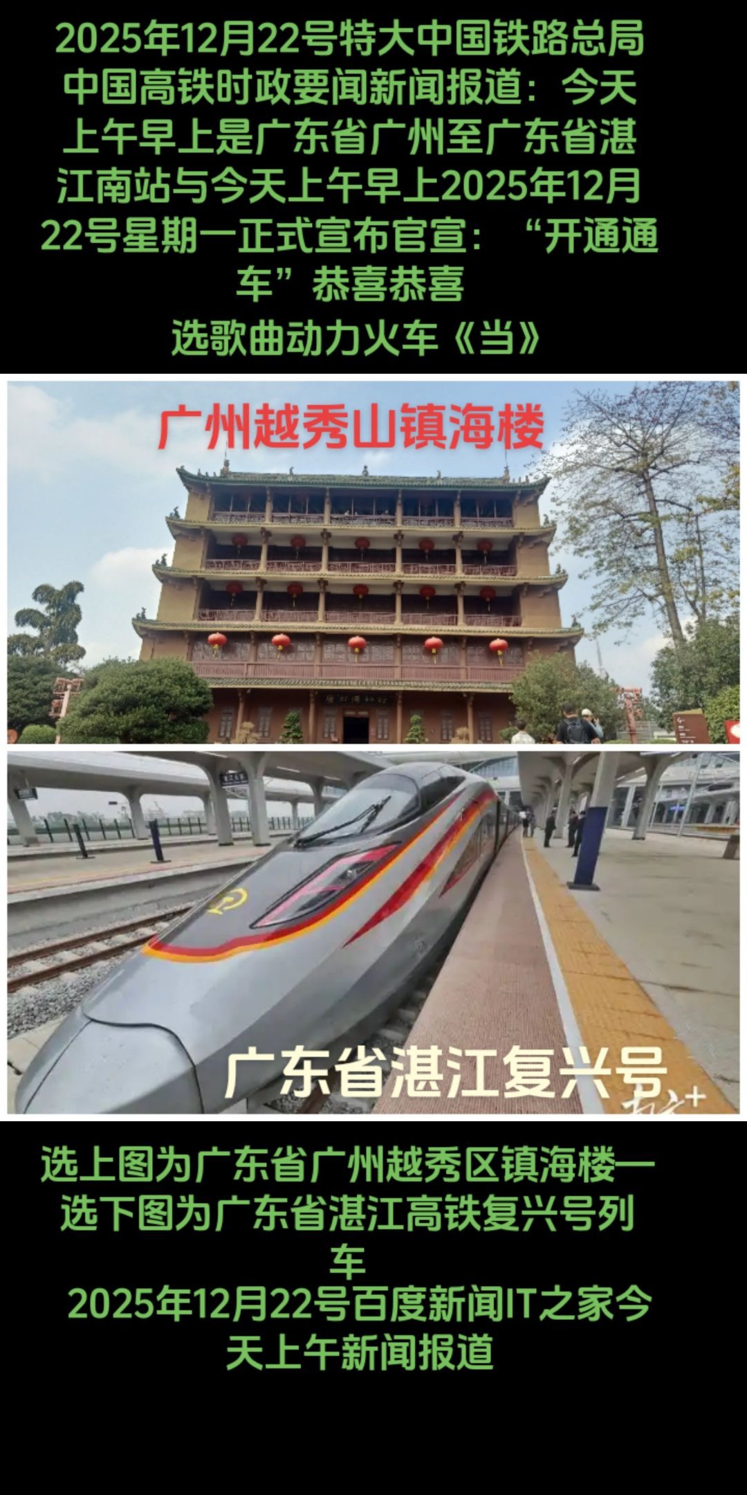 2025年中国高铁特大时政新闻报道————中国广东省广州从广州出发到中国广东省湛江北路—————2025年12月22号星期一今天下上午早上正式宣布官宣确认正式宣布开通通车呐中国高铁2025年12月22号百度新闻中国中新网新闻报道———选图中国为广东省广州越秀区越秀山:“镇海楼”羊城八景之一————选图为中国广东省湛江北路:“复兴号”列车:央视6公主蓝羽中国铁路