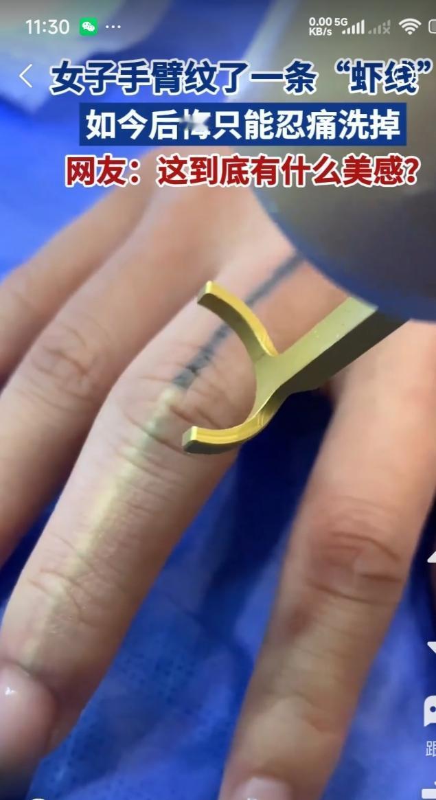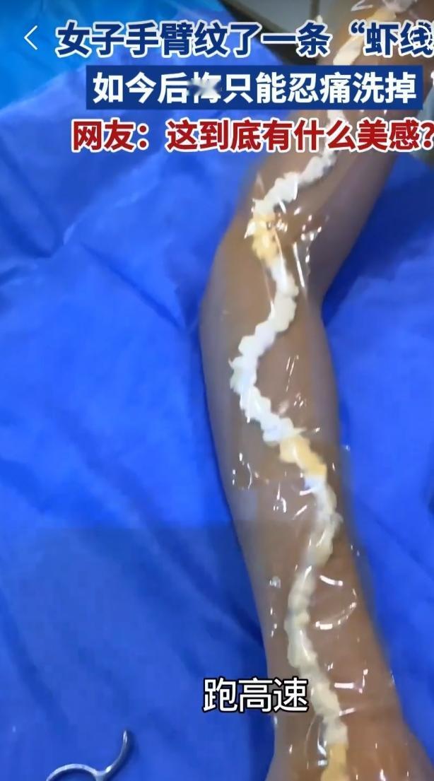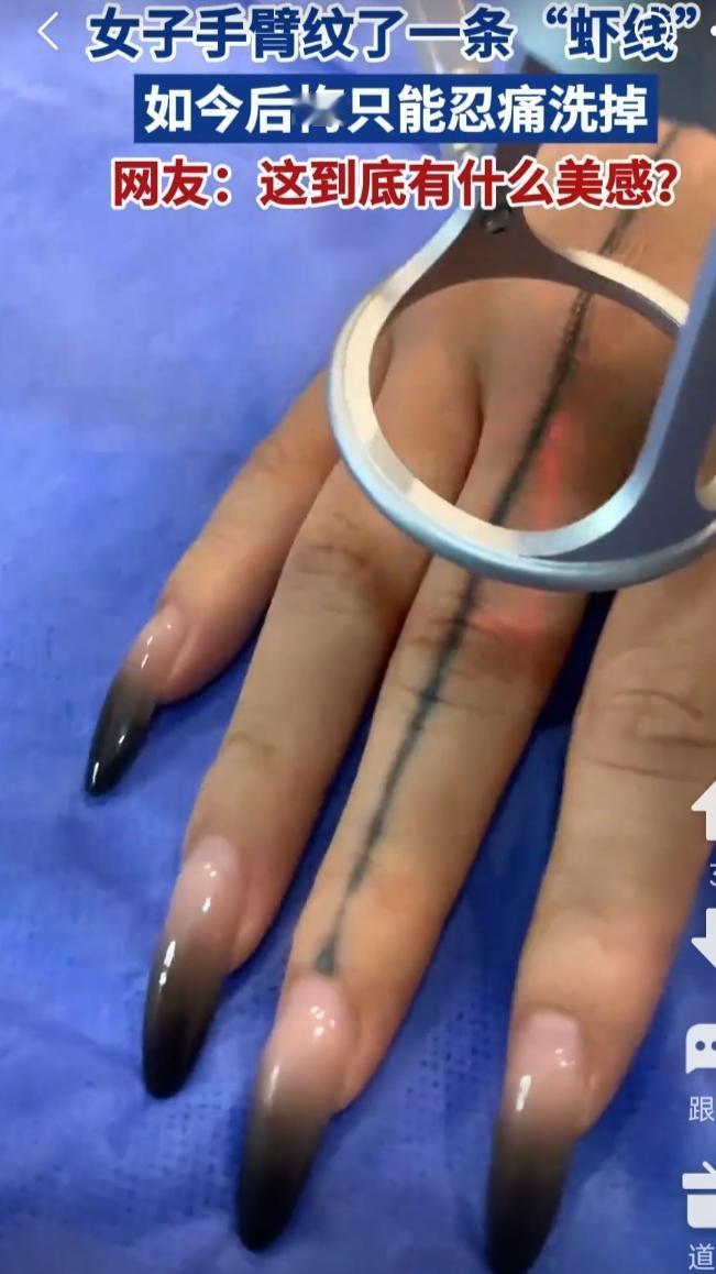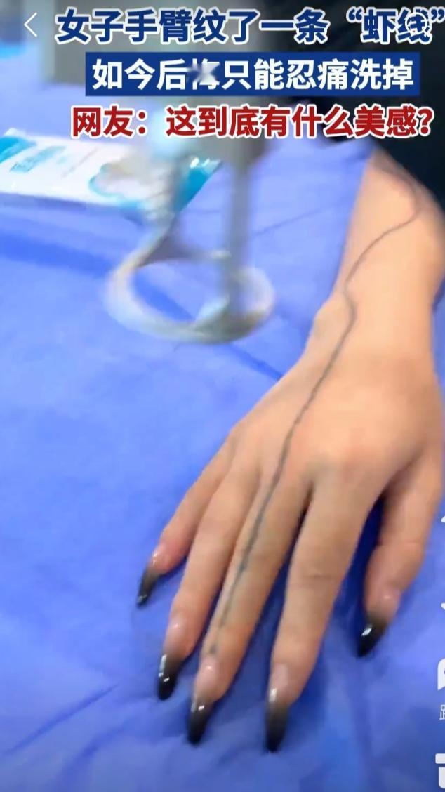 这个女子从手臂到手指纹了一条虾线。 也不知道她的美感从何而来。 网友说,这像是一条高速公路。 现在高速跑到家了,她只能忍着疼痛把它洗掉。 更有人说,它就像一条会下蛊的毒线。 这又是何苦呢? 要标新立异,也得选个好看的图案啊。