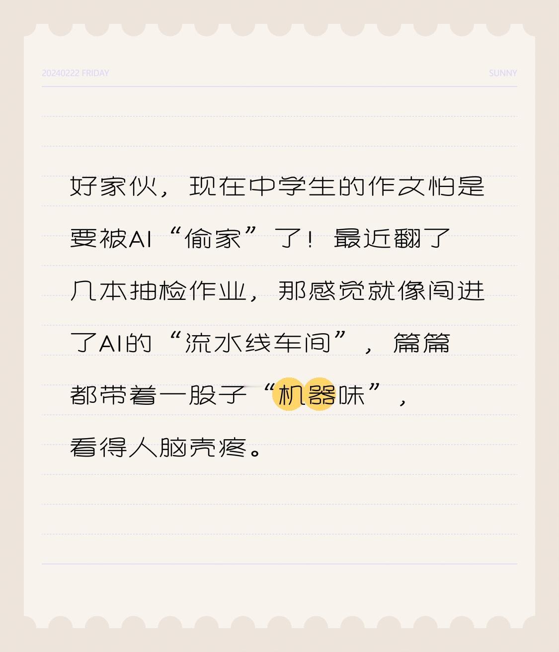 好家伙,现在中学生的作文怕是要被AI“偷家”了!最近翻了几本抽检作业,那感觉就像闯进了AI的“流水线车间”,篇篇都带着一股子“机器味”,看得人脑壳疼。 就说写青春的诗吧,本以为能读出点少年人的天马行空,结果好家伙,清一色的“蝉鸣”“风”“粉笔灰”“篮球”组合拳。“蝉鸣把盛夏烫出褶皱”这话听着挺文艺?可十篇里有八篇都藏着类似句子,就像给青春套了个模板化的“紧箍咒”,念来念去都是一个调调。 这不就跟某些网文似的?满篇“烟锅斗”“水流了一地”,看似辞藻华丽,实则像机器人堆乐高,零件都对,但拼不出真感情。中学生本该是“脑洞比黑洞还大”的年纪,怎么就甘心当AI的“提线木偶”了? 有人说老师没察觉?我看未必,说不定老师改作业时心里正嘀咕:“这届学生的灵感怕不是集体住在AI服务器里了?” 人工智能是好帮手,但总不能让它替我们“动心”“动脑”吧?不然再过几年,孩子们写作文怕是要变成“复制粘贴大赛”,那多没劲! 你说,这AI写作文的风气,该怎么刹住呢?😉AI写作业 ai写作文神器 ai拯救作文 ai作业