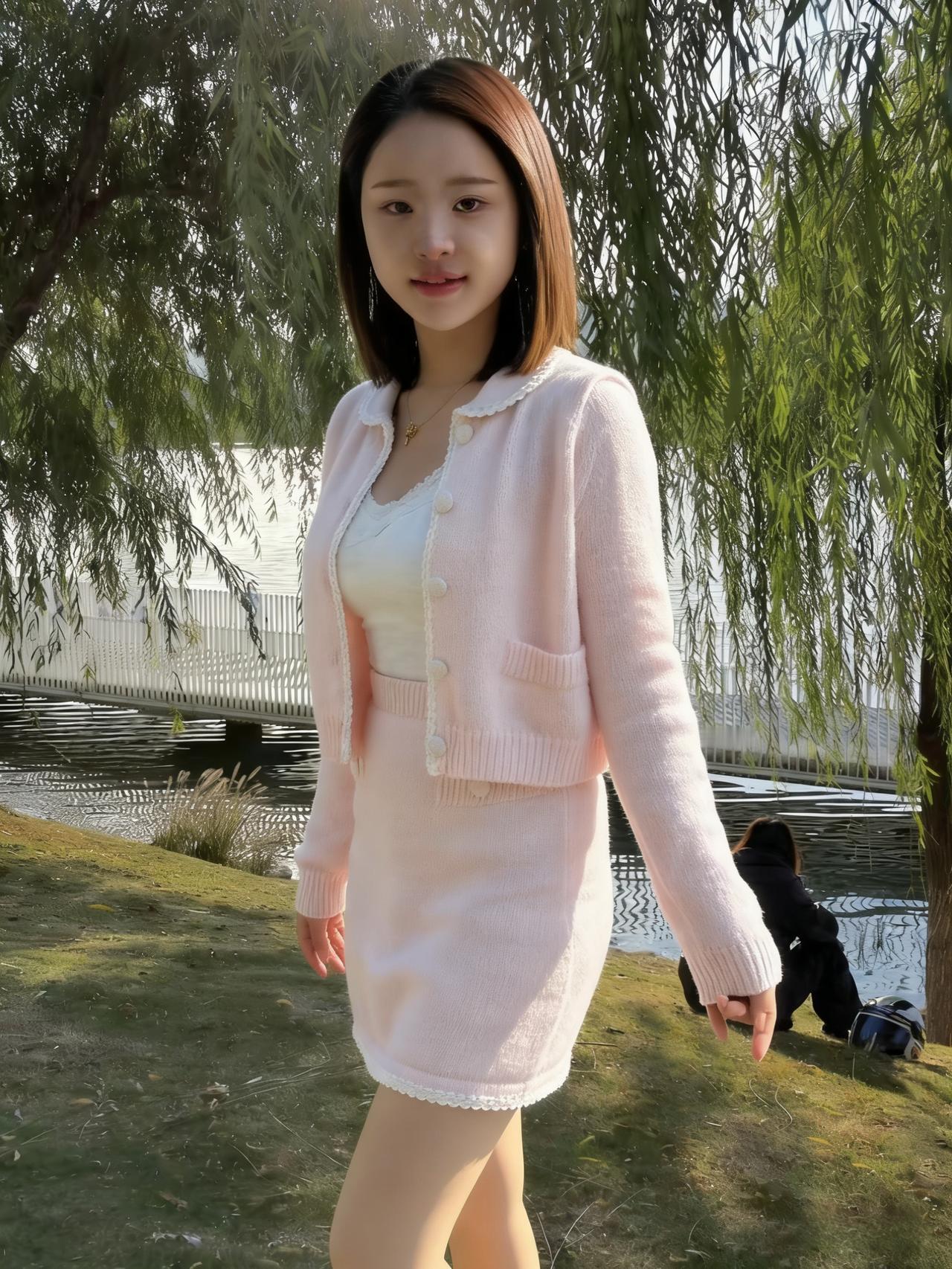 粉衫粉裙立湖滨,柳影轻摇拂玉身。 笑靥如花融暖日,春水多情照佳人。