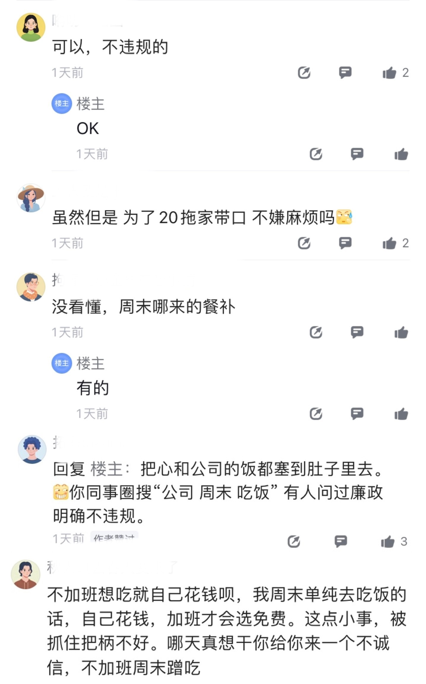 为什么大厂人这么赚,周末还要去蹭公司的餐?阿里员工在同事圈问,周末去公司食堂蹭餐补,会不会被查,能不能带家人一起?有同事回复,“之前有人问过廉政,明确不违规”。不得不说,互联网公司确实要更人性化。但也有人说,为了20的餐补,不值当,万一哪天公司真想找茬,扣一个不诚信的帽子,得不偿失。阿里员工肯定不差这顿饭钱,但为啥大费周章的整这么一出,真就因为住的近?