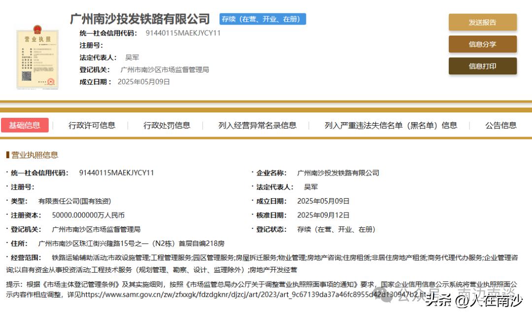 【南投铁来了!】据广州南沙经济技术开发区国有资产监督管理局消息,近期,依据管委会及区委的工作部署安排,全资一级公司——广州南沙投发铁路有限公司正式设立。该公司注册资本5亿元。公司住所位于广州市南沙区珠江街兴隆路15号之一(N2栋)首层自编218房。 广州南沙投发铁路有限公司成立于2025年5月9日,由广州南沙经济技术开发区管理委员会控股。在2025年9月12日,公司名称由广州南沙投资发展有限公司变更为现名。 其经营范围广泛,涵盖铁路运输辅助活动、市政设施管理、工程管理服务、园区管理服务、房屋拆迁服务、物业管理、房地产咨询、住房租赁、非居住房地产租赁、商务代理代办服务、企业管理咨询、以自有资金从事投资活动、工程技术服务(规划管理、勘察、设计、监理除外)以及房地产开发经营等多个领域。 很明显南投铁应该是南沙为了专注开发南沙高铁站而设立的全新公司,而早前发布的南沙站下沉广场、地下中央城市通廊及地下配套工程、南广场一体化配套设施工程等项目的招标,就是由这家全新的南沙投发铁路公司发出的。