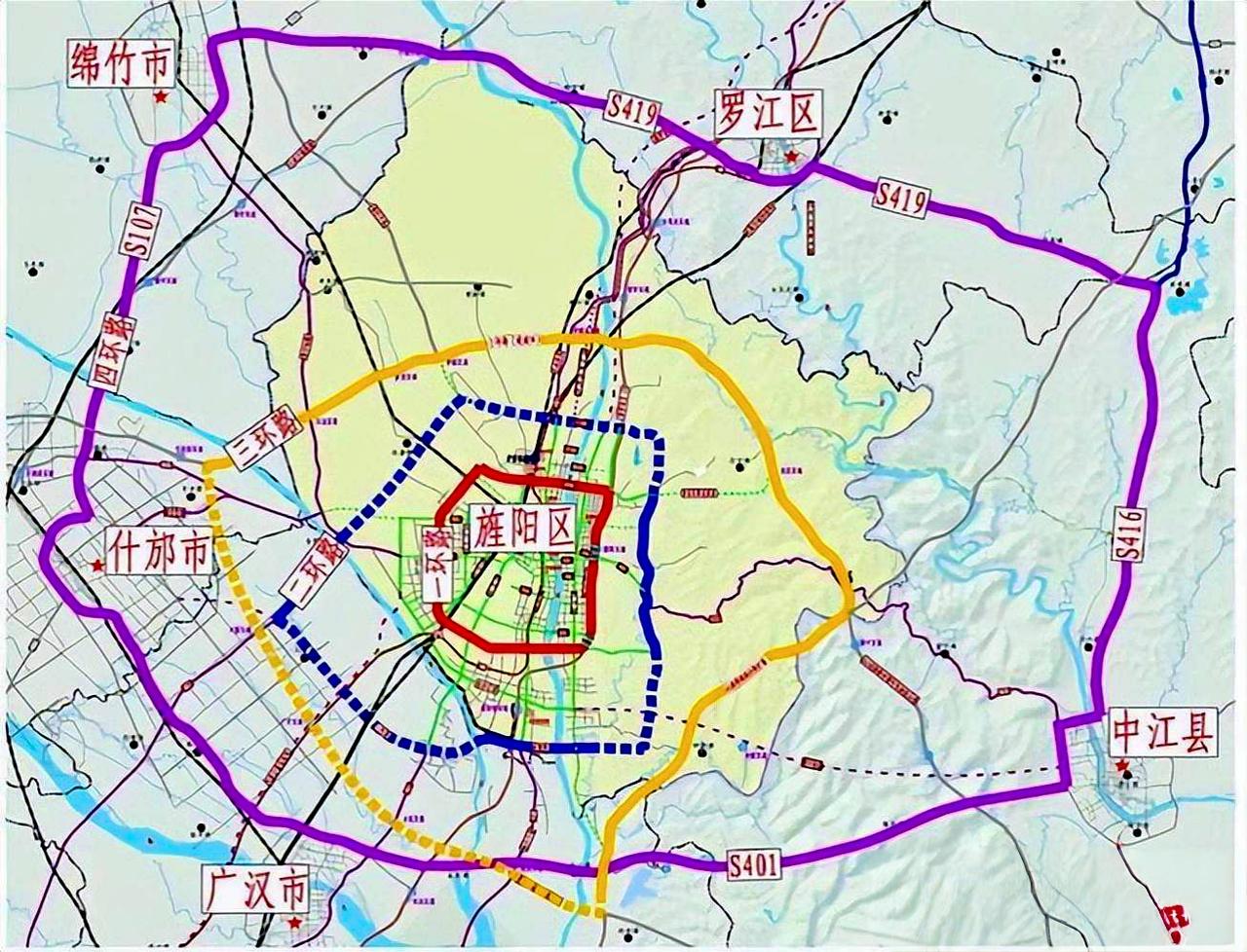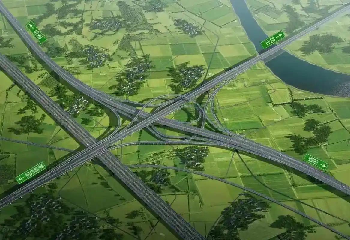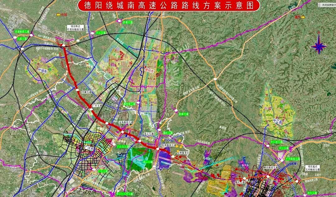 【德阳绕城南高速公路新建工程】正在抓紧推进,建设工期48个月。项目全长约61千米,估算投资约167亿元,建设用地面积约6455亩,采用双向六车道标准建设,设计时速120千米。路线起于中江县玉兴镇,对接成都都市圈环线高速、德遂高速,途经兴隆镇,辑庆镇,集凤镇,广汉市连山镇,金鱼镇,小汉镇,南丰镇,金轮镇,止于什邡市禾丰镇,对接成都都市圈环线高速。设置互通立交10处(玉兴、辑庆、松林、金鱼、什邡东枢纽,凯州新城、连山、小汉、广什、兴隆互通),服务区1处,连接线1条1400米。项目的建设有利于完善区域交通路网结构,助推西部陆海新通道升级,助力实现德眉资“一小时通勤圈”,推动成渝双城经济圈协同发展,提升人民群众的获得感及幸福指数。