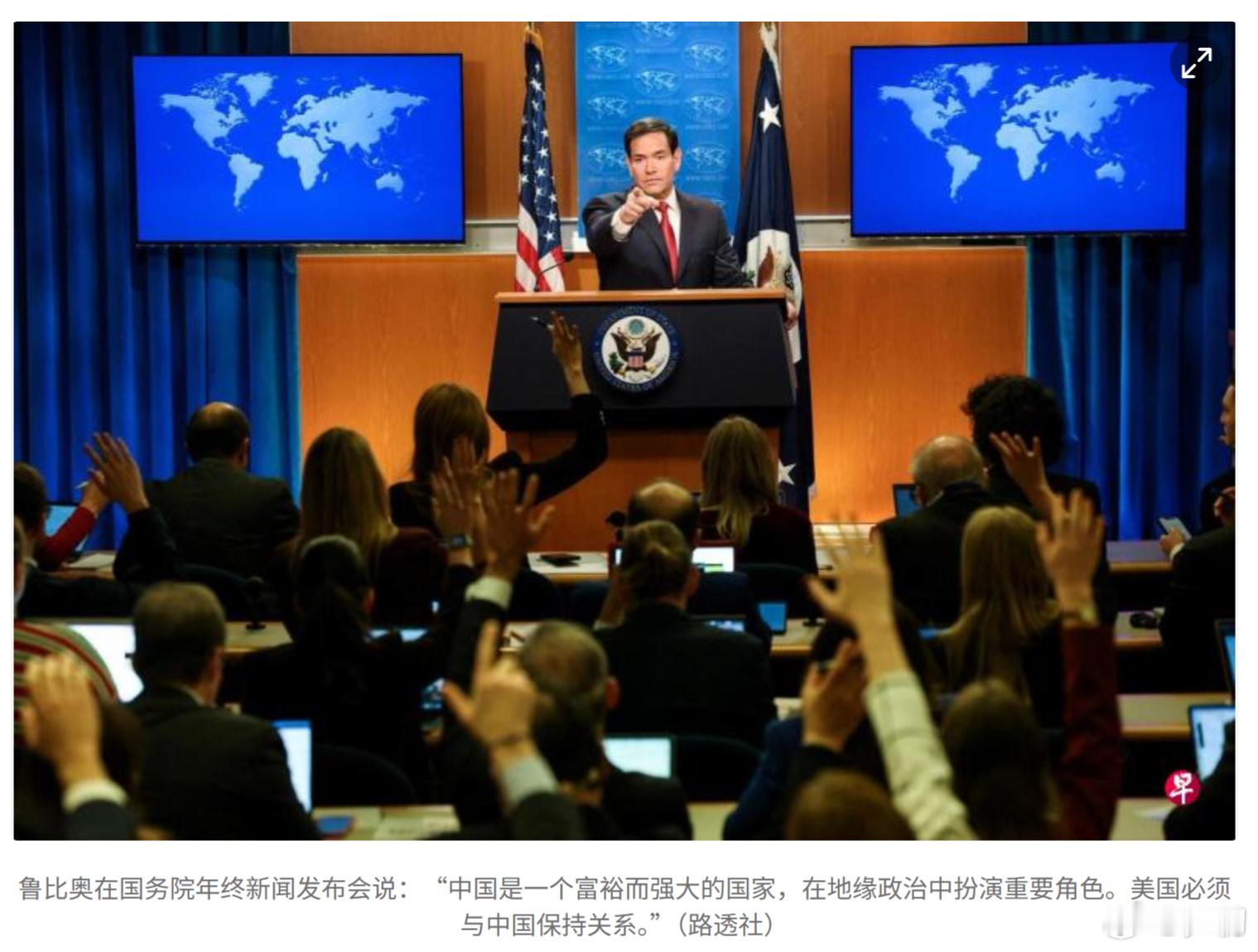 路透社:美国国务卿鲁比奥在国务院年终新闻发布会说:“中国是一个富裕而强大的国家,在地缘政治中扮演重要角色。美国必须与中国保持关系。”在担任美国参议员期间,鲁比奥一直被视为对华鹰派人物,但他此次公开表示,他自觉对中国一直挺友好。中国还没有解除对鲁比奥的制裁吧?你看,这制裁的效果不挺好嘛!