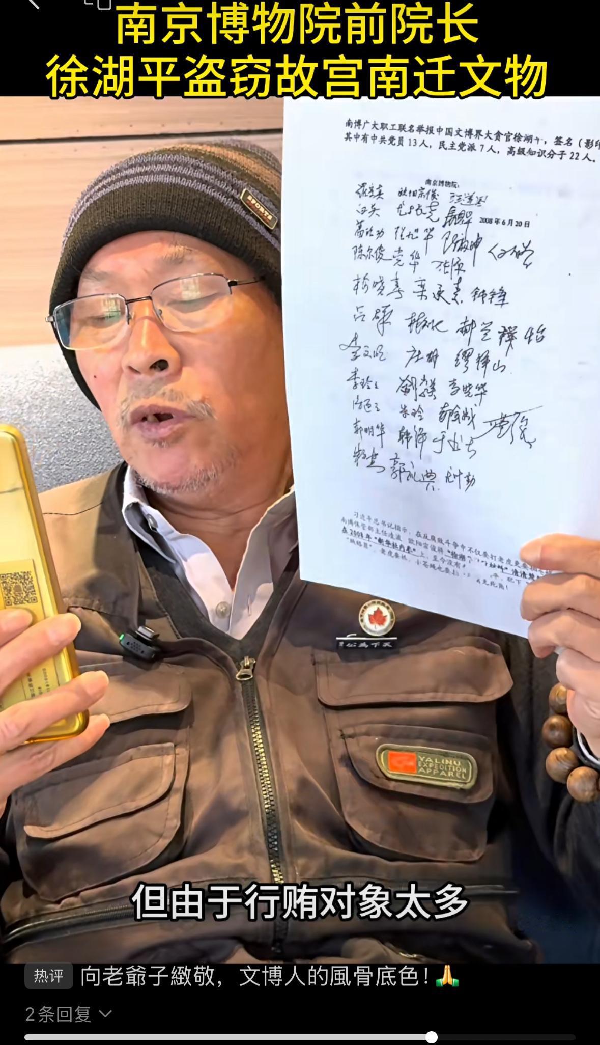助力一下吧,为了国家的文物! 微信视频号"南博典藏人",一个自称为南京博物院前工作人员的老人公开举报南博前院长,盗窃故宫南迁文物。 真假有待核实,但视频中呈现的工作证应该是前工作人员,作为一名退休职工,凭空诬陷可能性不大吧,第一个他没有必要,第二他得不到任何好处。 如果站在爱国的立场,为国家追回这些宝贵文物,就能解释的通,大家觉得呢? 据视频介绍,前院长先把南迁文物找专家鉴定为赝品,然后再出售给他主管的文物店,然后再从文物店卖给上海他儿子开的文物拍卖公司,再卖到国外,之前就有四十多名员工联名举报过,但因涉及人数众多,后来都不了了之。如果是真的,确实是太可怕了,如果是真的,也给这位老人助力一下吧,为了咱们国家的文物!