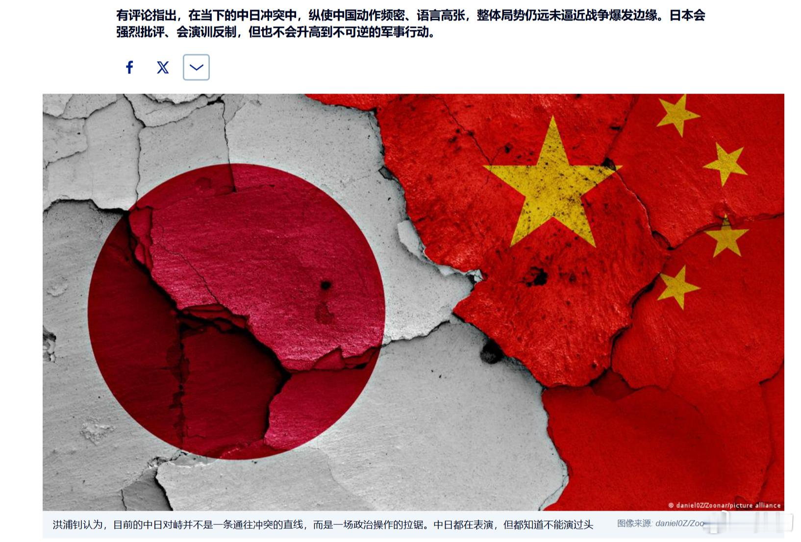 《德国之声》:在当下的中日冲突中,纵使中国动作频密、语言高张,整体局势仍远未逼近战争爆发边缘。日本会强烈批评、会演训反制,但也不会升高到不可逆的军事行动。中日都在表演,但都知道不能演过头。大家都赌你不敢打,到目前为止,这几十年来都赌对了。