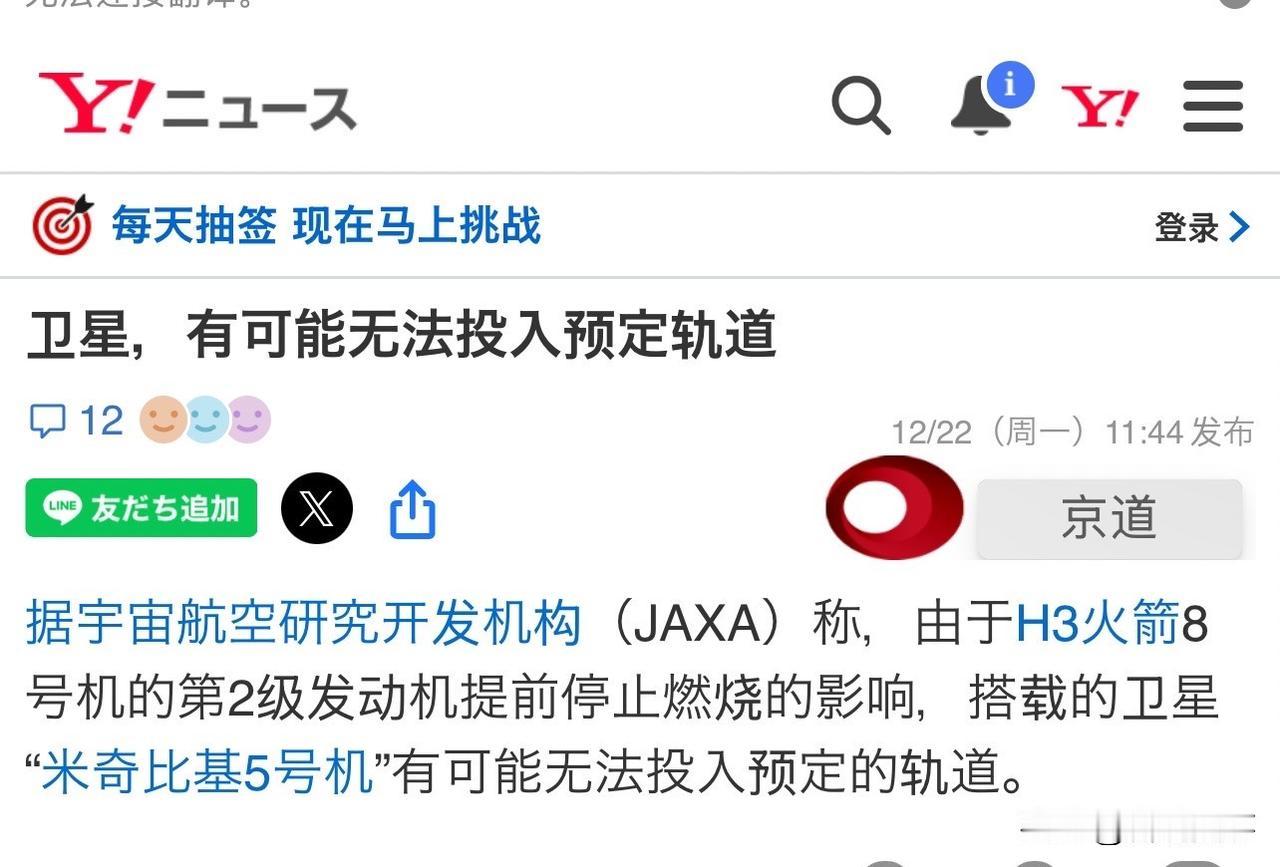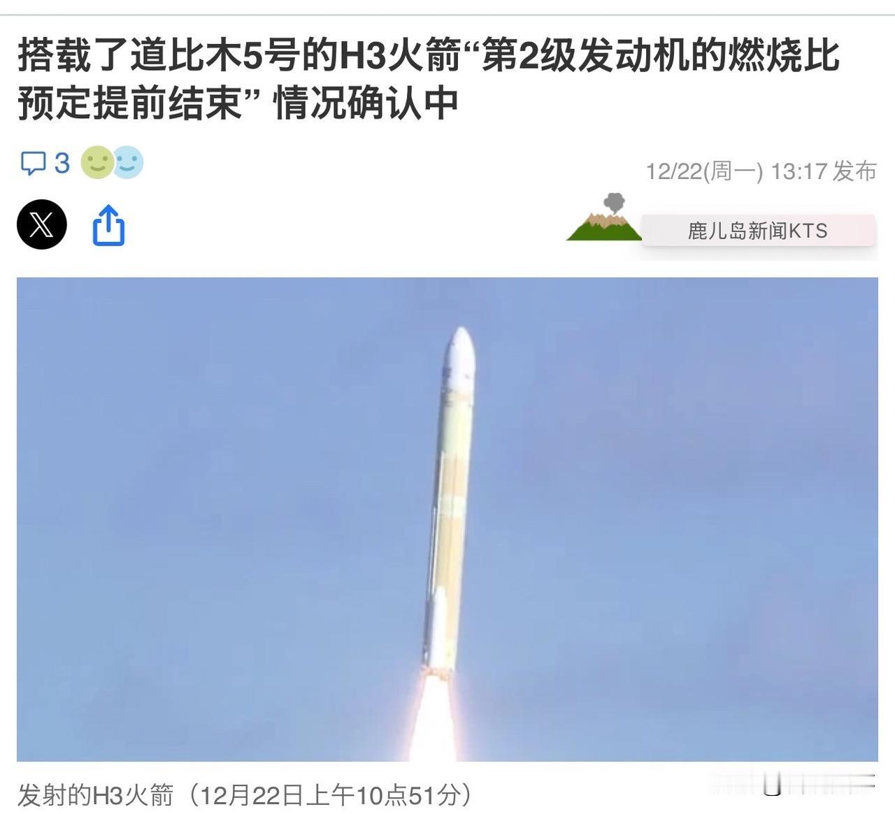 急眼了!日本H3火箭发射再次失败,日版GPS组网受阻。 就在今天! 当地时间12月22日10时51分,日本H3火箭8号机从鹿儿岛县种子岛宇宙中心点火升空,然而升空后不久突发故障——第二级发动机提前停止燃烧,日本宇宙航空研究开发机构(JAXA)确认,搭载的"引路5号"准天顶卫星大概率无法进入预定轨道,任务宣告失败。 值得一提的是,"引路5号"是日本准天顶卫星导航系统(日版GPS)的关键组网卫星,该系统计划2026年前完成7颗卫星部署,以实现不依赖美国GPS的自主高精度定位服务。然而,截止目前这款被日本推为新一代主力卫星共发射8次,成功4次。