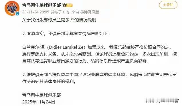 看来兰克尔泽没有说谎,青岛海牛的确有欠薪的情况! 近日中足联公布了三级联赛首批完成欠债清查球队名单,然而青岛海牛却没有出现在这份名单之中,虽然说俱乐部可能因为部分材料没有提供到位,但是业内人士都知道,最关键的就是球员是否在工资表上签字的这份材料,其他的都很好完成的。 由此也证明了一个事实,那就是青岛海牛确实有欠薪的情况,而之前“避战”逃跑的喀麦隆外援兰克尔泽当时说的可能是实话,当时兰克尔泽为了抗议青岛海牛欠薪,在最后一轮与浙江队比赛前私自离开球队,并且还通过个人社交平台发文称自己不愿意留在欠薪队,随后海牛俱乐部发文予以驳斥称严格按照合同约定,履行薪酬支付义务,从未拖欠薪酬,并指责兰克尔泽违反合同约定,多次出现旷工、擅自离队等违反职业道德的行为。 不过很多事情是纸包不住火的,随着中足联公布 首批完成清欠俱乐部名单后,青岛海牛一些鲜为人知的内幕就浮出了水面,就如今的情况来看,兰克尔泽似乎说的更有根据和可信度![作揖][作揖][作揖]