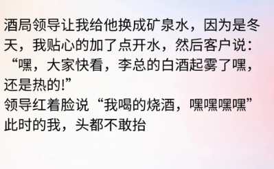 酒局领导让我给他换成矿泉水,因为是冬天,我贴心的加了点开水,然后客户说:"嘿,大家快看,李总的白酒起雾了嘿,还是热的!"