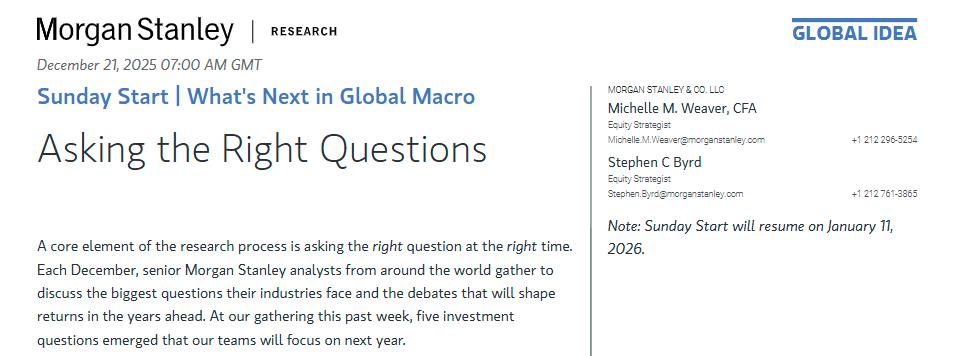 国际著名投行摩根士丹利近期研报敲定了2026年需要重点关注的五大投资问题,对大A