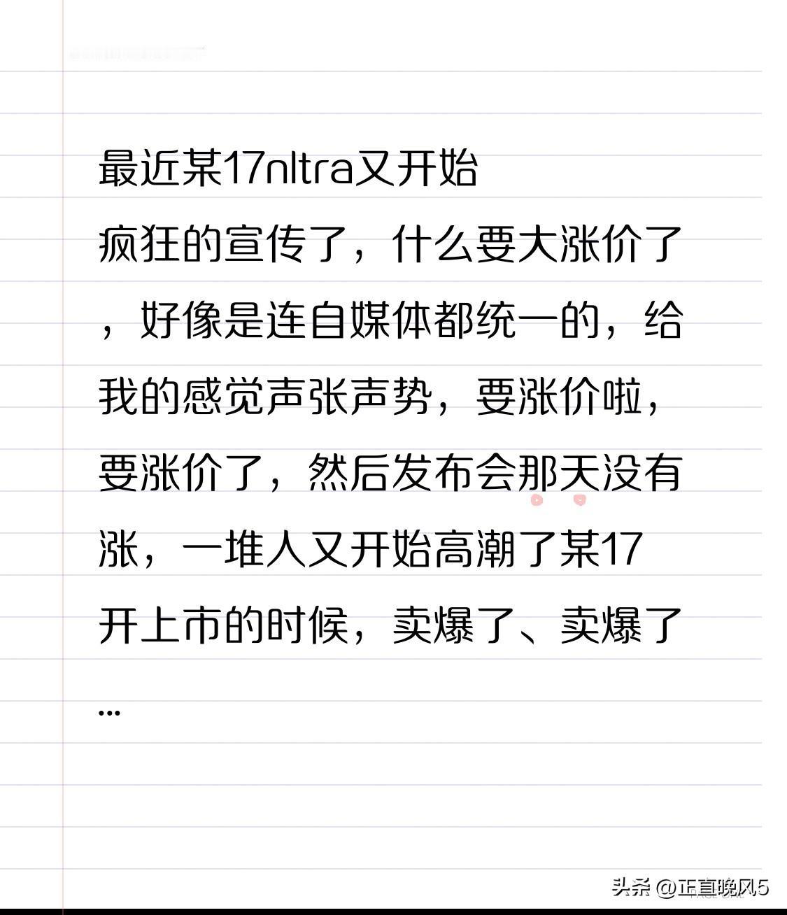 最近某17nltra又开始疯狂的宣传了,什么要大涨价了,好像是连自媒体都统一的,给我的感觉虚张声势,要涨价啦,要涨价了,然后发布会那天没有涨,一堆人又开始高潮了[捂脸][捂脸][捂脸] 某17开上市的时候,卖爆了、卖爆了,结果统计机构一出来,连名字都没有,真是笑死我了,这就是他们所谓的高端成了,但是他们的博主和粉丝又不吭声了