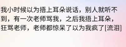 我小时候以为捂上耳朵说话,别人就听不到,有一次老师骂我,之后我捂上耳朵,狂骂老师,老师都惊呆了以为我疯了