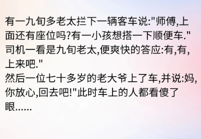 有一九旬多老太拦下一辆客车说:"师傅,上有座位吗?有一小孩想搭一下顺便车." 然后一位七十多岁的老大爷上了车,并说:妈,你放心,回去吧!"