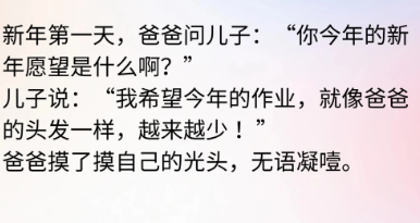 爸爸问儿子:“你今年的新年愿望是什么啊?” 儿子说:“我希望今年的作业,就像爸爸的头发一样,越来越少 !”